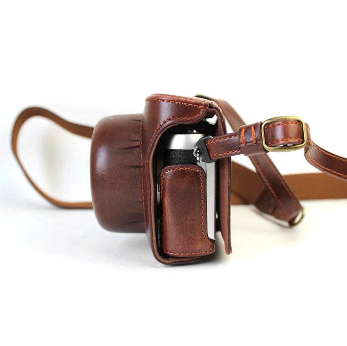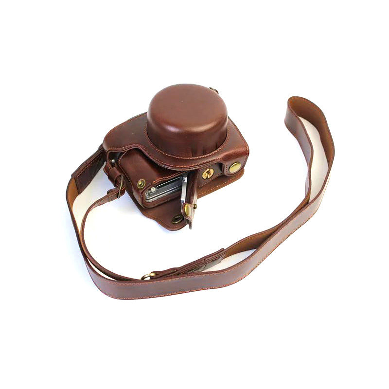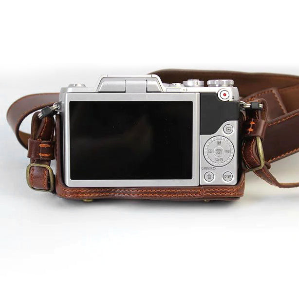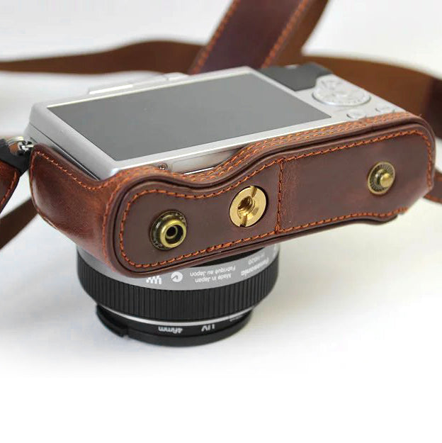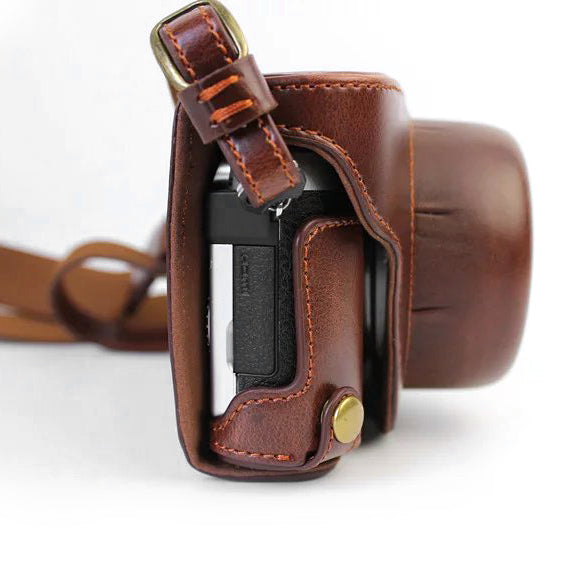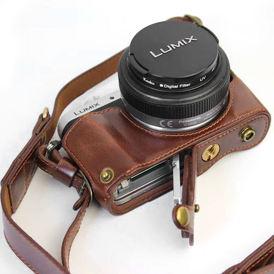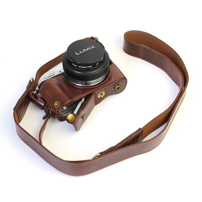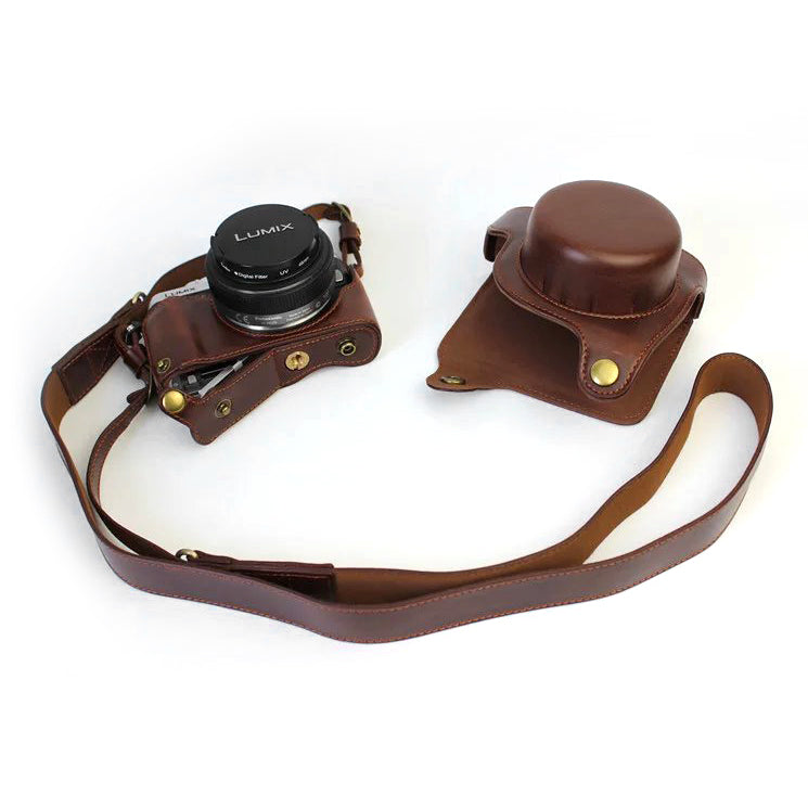 PU Leather Camera Protective Pouch + Strap for Panasonic DMC-GF8/GF7 - Coffee