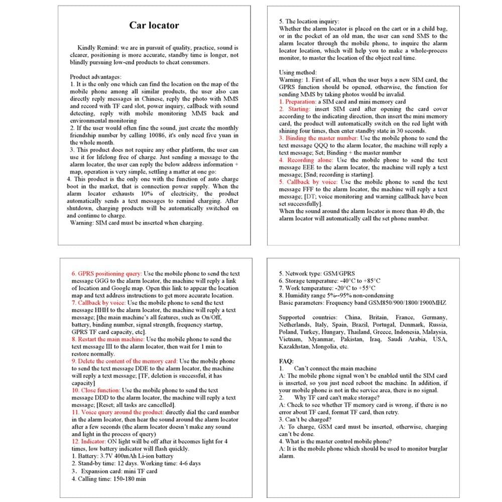 This 2 in 1 car charge+tracker can find the location on the map of the mobile phone callback with sound detecting.Features:GPS positioning and tracking via SMS mobile phone real time monitoring your vehicle.When the alarm locator exhausts 10% of electricity the product automatically sends a text messages to remind charging.With USB port can charge mobile phone MP3 player camera GPS navigator and other similar electronic devices.With the function of charge automatically boot.Specifications:Color: black white (optional)Material: ABSGPS positioning accuracy: 10mItem size: 90 * 30 * 25mm / 3.5 * 1.2 * 1.0inItem weight: 23g / 0.8ouncePackage size: 90 * 30 * 30mm / 3.5 * 1.2 * 1.2inPackage weight: 30g / 1.7ouncePackage list:1 * Car GPS Tracking Machine