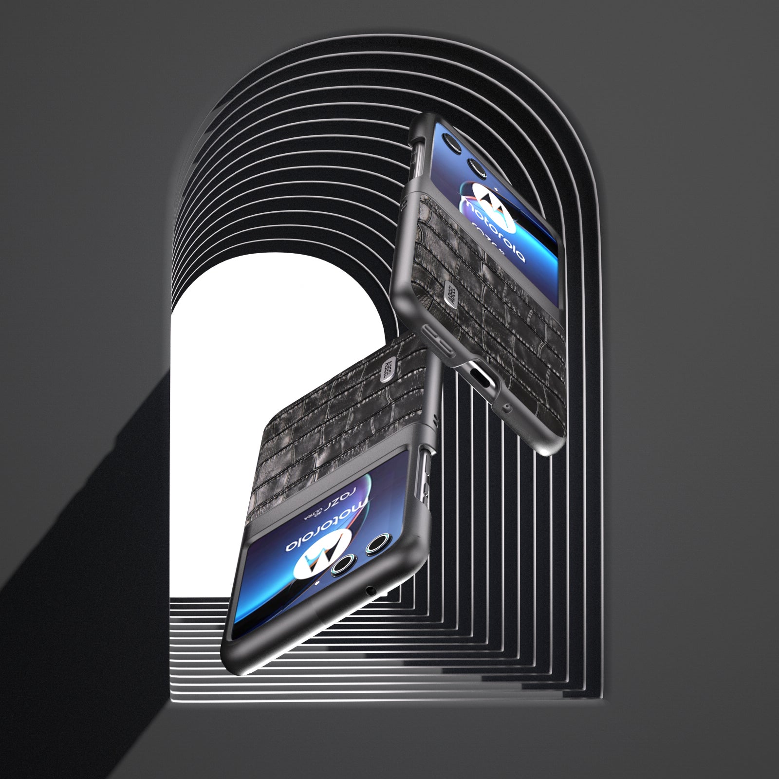 Uniqkart For Motorola Razr 40 Ultra 5G Phone Case Genuine Cow Leather Crocodile Texture Slim Phone Cover - Black