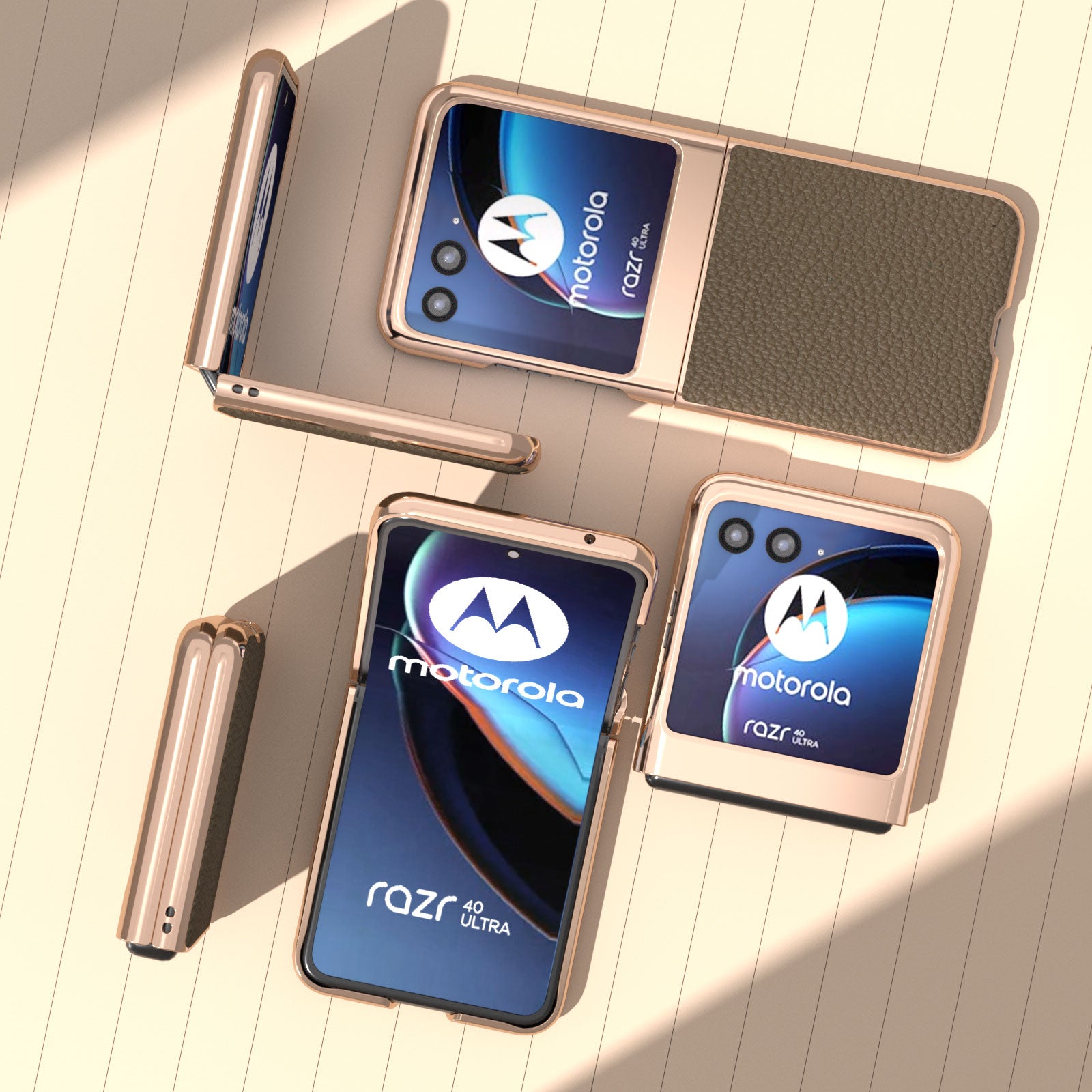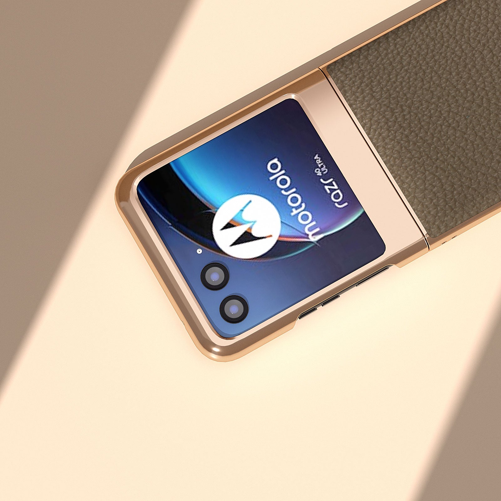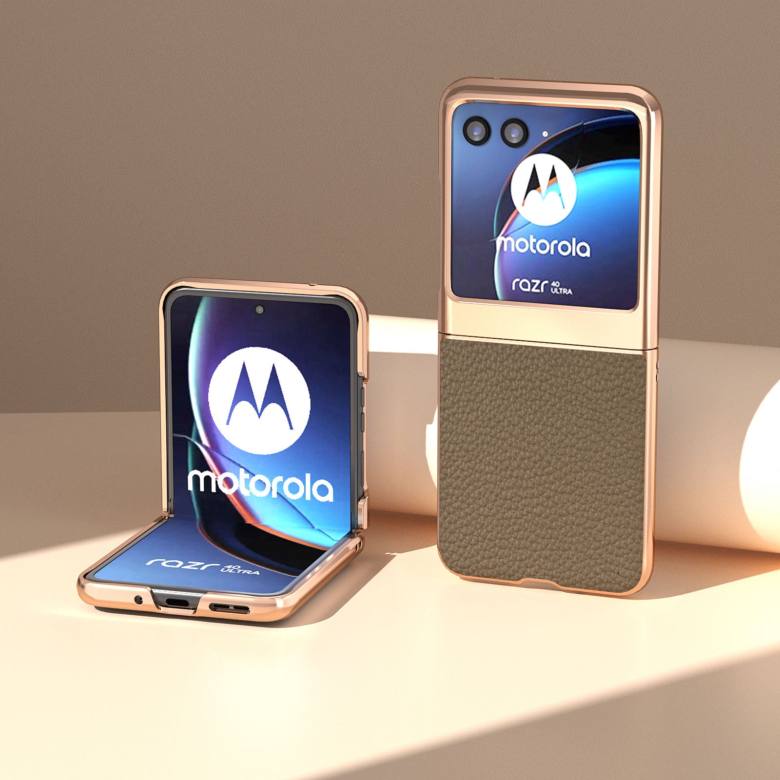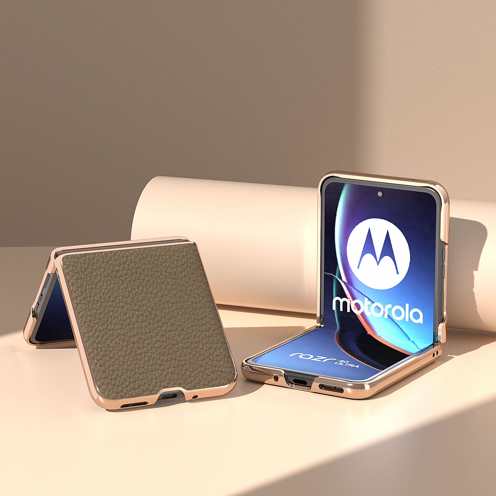Uniqkart for Motorola Razr 40 Ultra 5G Genuine Cow Leather Coated PC Phone Shell Electroplating Litchi Texture Shockproof Cover - Khaki