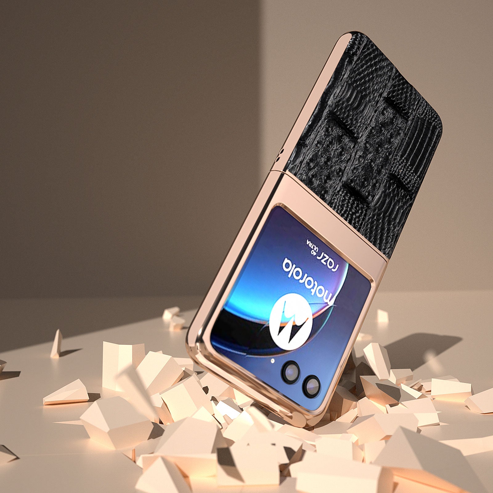 Uniqkart for Motorola Razr 40 Ultra 5G Mahjong Texture Genuine Cow Leather+PC Phone Case Nano Electroplating Phone Cover - Black