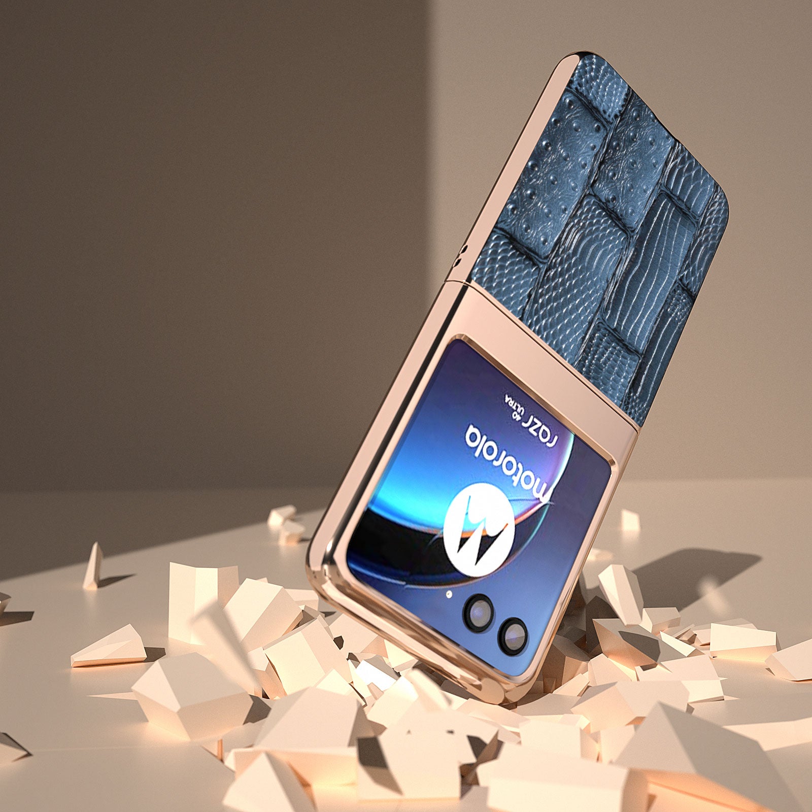 Uniqkart for Motorola Razr 40 Ultra 5G Mahjong Texture Genuine Cow Leather+PC Phone Case Nano Electroplating Phone Cover - Blue