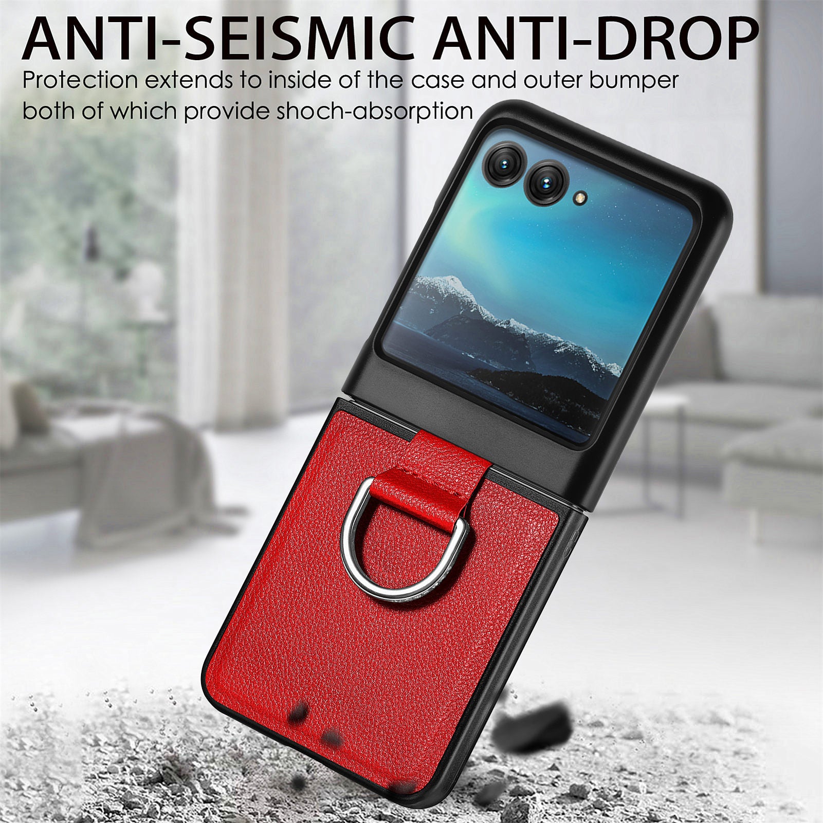 Uniqkart for Motorola Razr 40 Ultra 5G PU Leather Coated PC Phone Case Finger Ring Holder Litchi Texture Phone Cover - Red