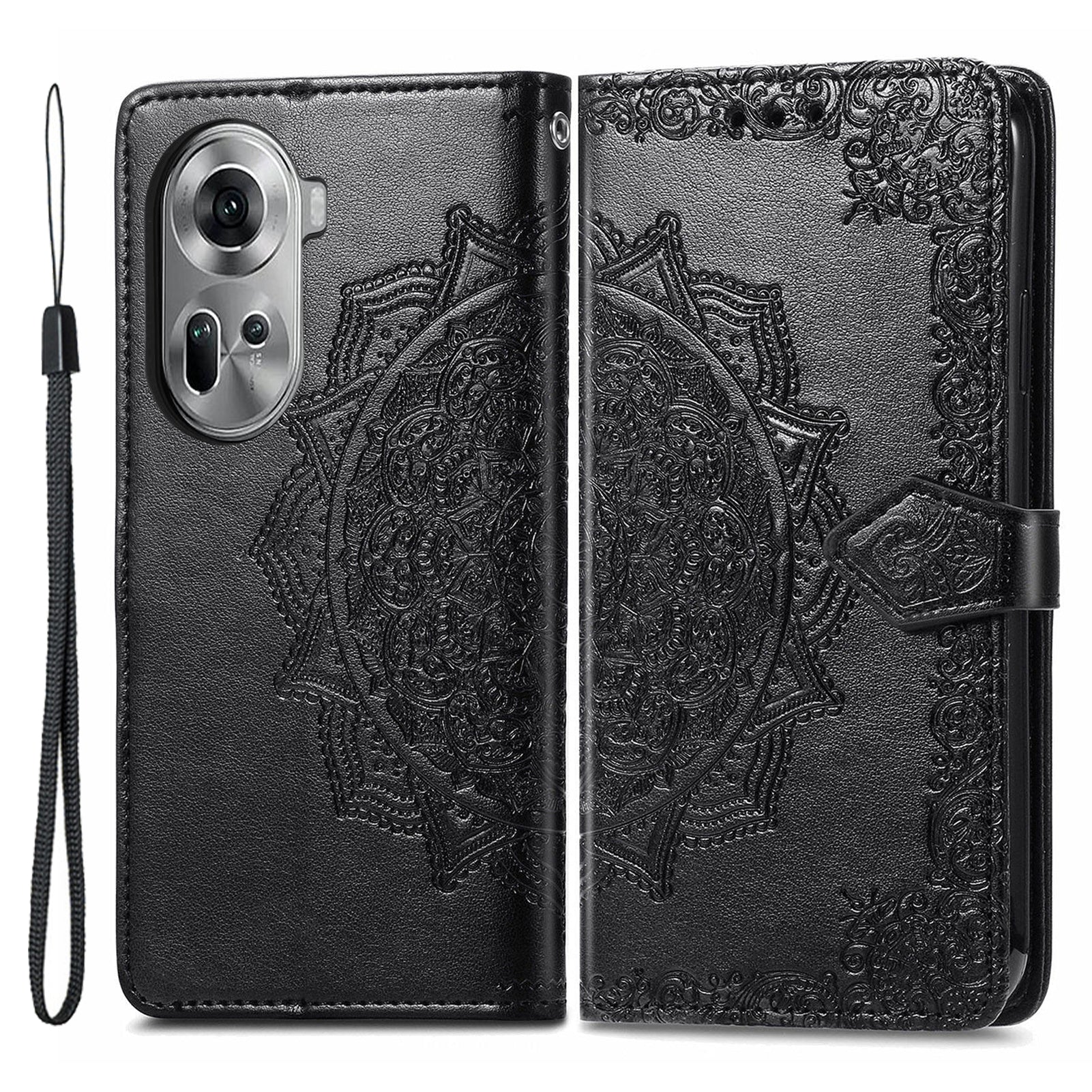 For Oppo Reno11 5G (Global) Leather Phone Case with Card Slots Wallet Emboss Mandala Flower - Black