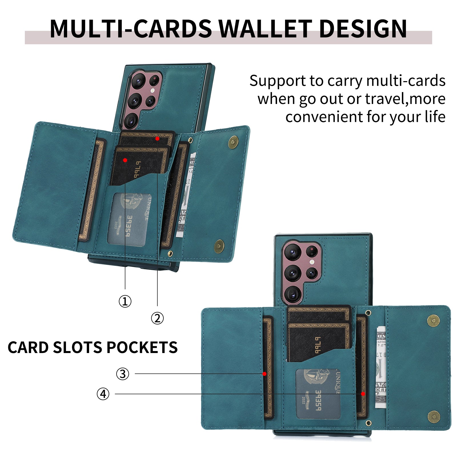 For Samsung Galaxy S24 Ultra Cell Phone Case Tri-fold Wallet Kickstand PU Leather Coated TPU Cover - Blue
