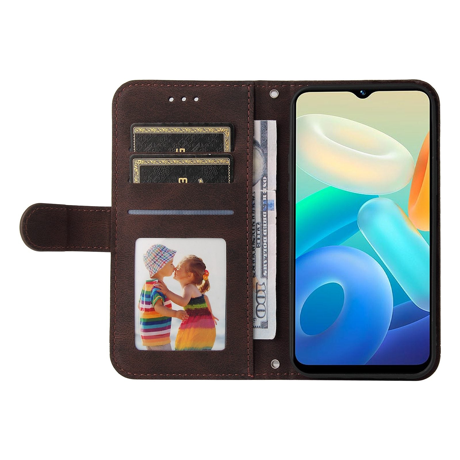 For vivo Y02s 4G / Y16 4G Lines Imprinted Skin-touch PU Leather Wallet Case Tree Pattern Metal Button Stand Flip Shockproof Cover with Strap - Brown