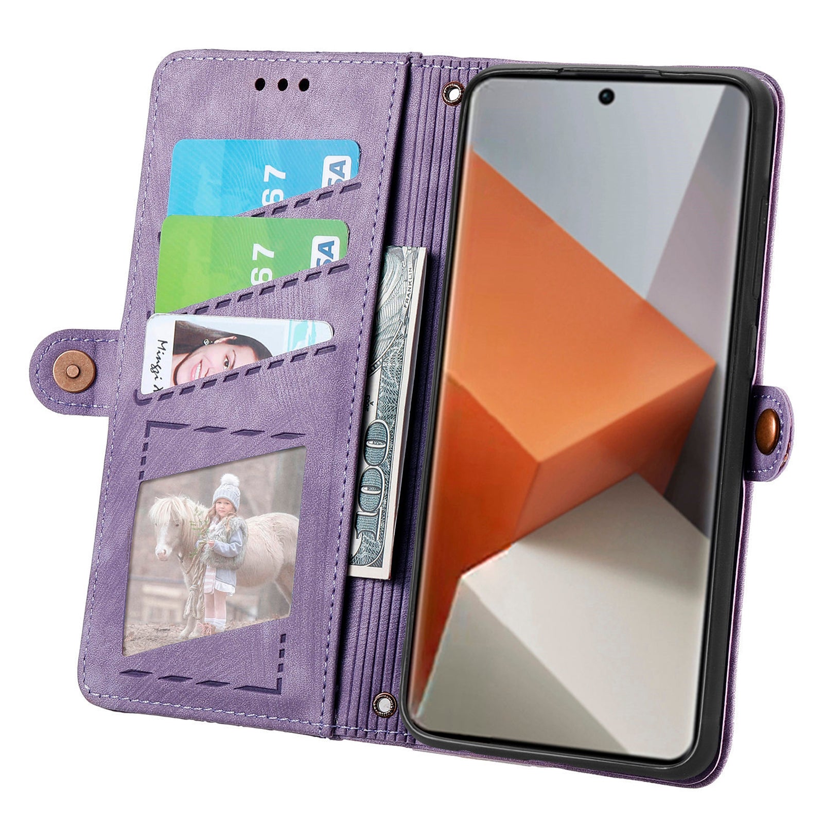 For Xiaomi Redmi Note 13 Pro+ 5G Cell Phone Case Imprinted Zipper Pocket Shockproof Cover with Stand - Purple