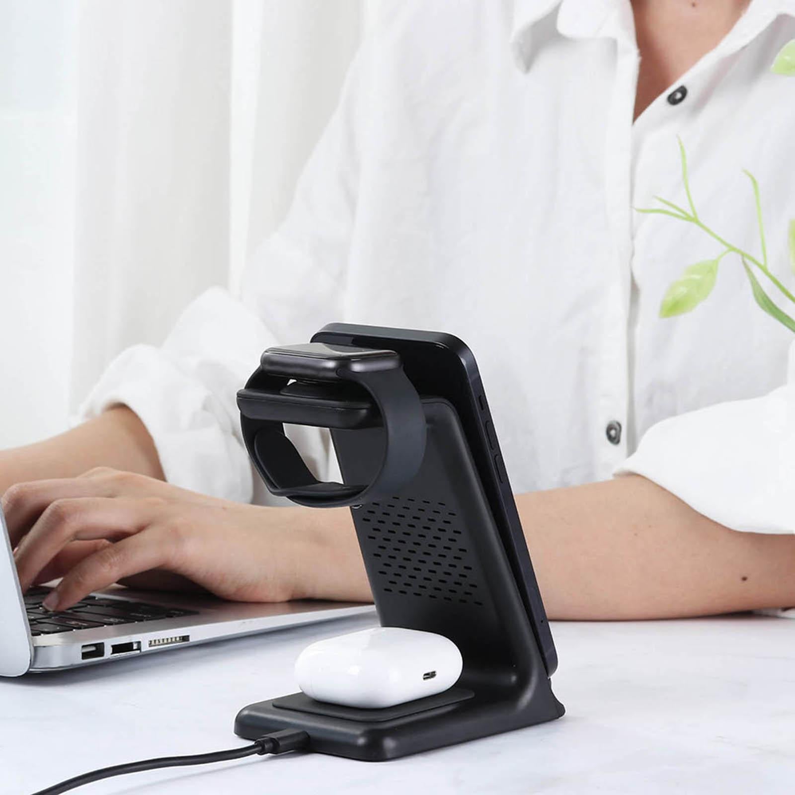 3 in 1 wireless charging station, provides a wireless charging speed with a maximum speed of 15W, for iphone apple watch and at once, sneed not storage cable make your desktop tidier and cleaner.
