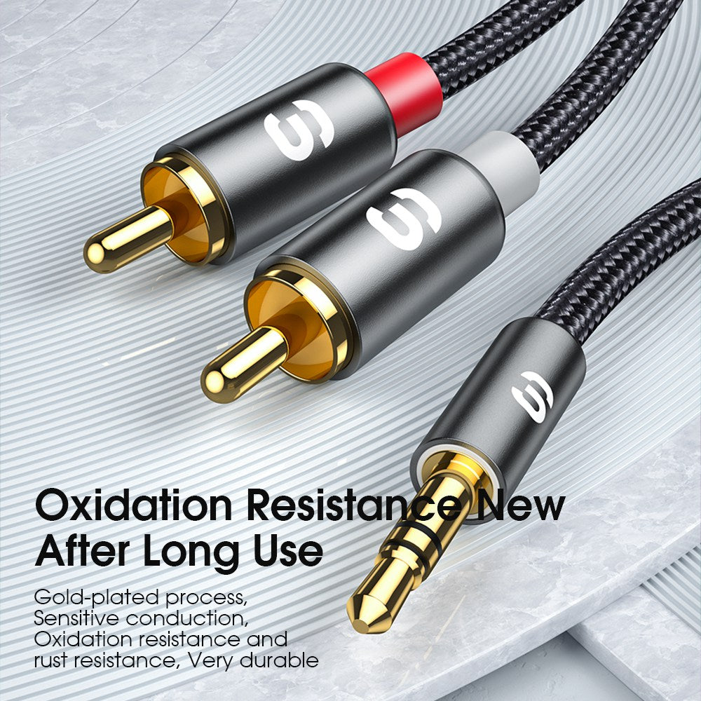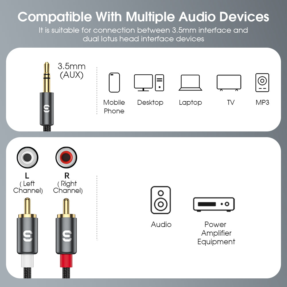 - [Universal Compatibility] 3.5mm Aux to 2RCA stereo audio cable is compatible with iPhone/iPod, smartphones, MP3 and any digital devices with 3.5mm jack to stereo receiver, amplifier, speaker with 2RCA port