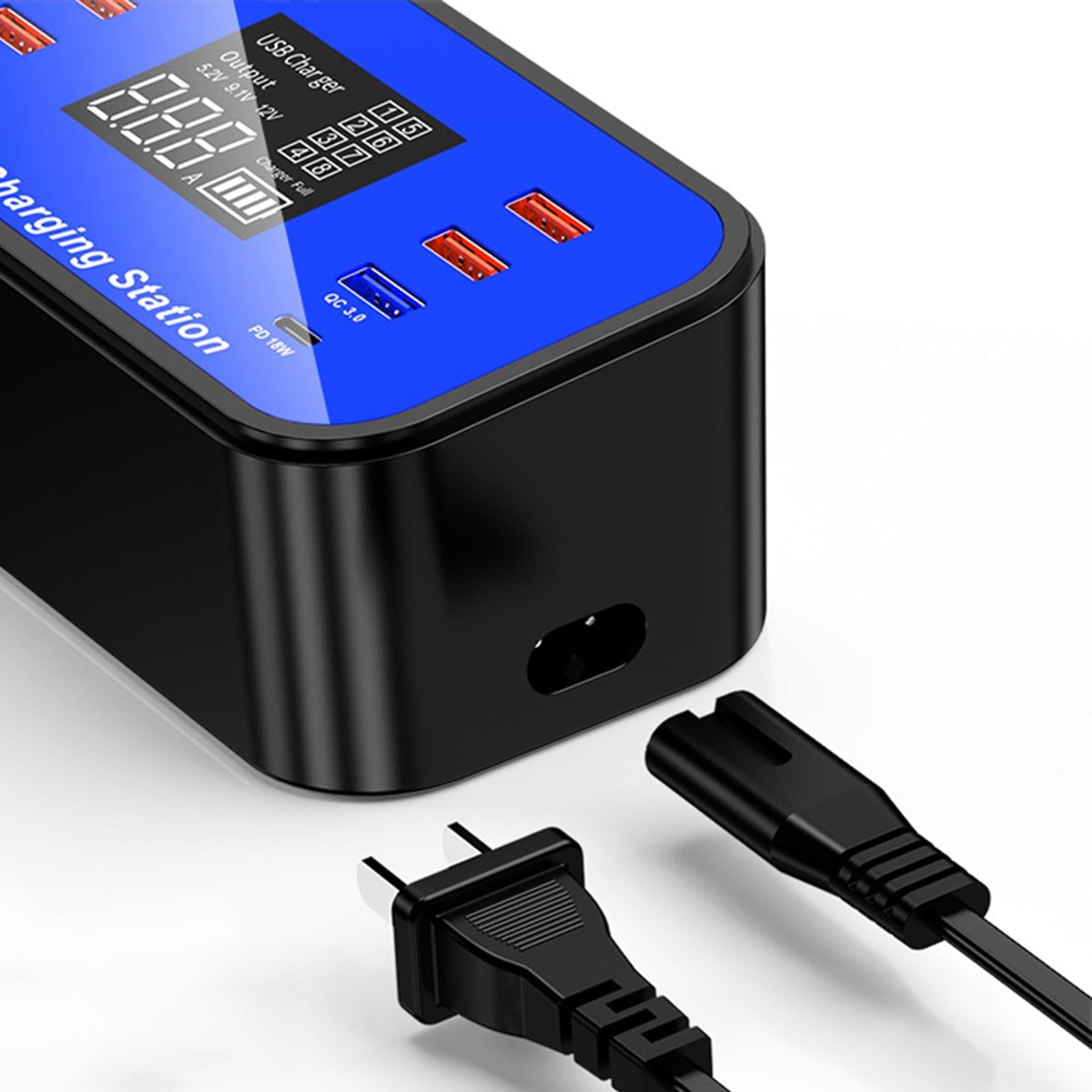 8 Ports Charger: Can charge up to 8 devices , 1 QC3.0 fast charging port, 1 Typc-c charging port, and 6 common USB ports.