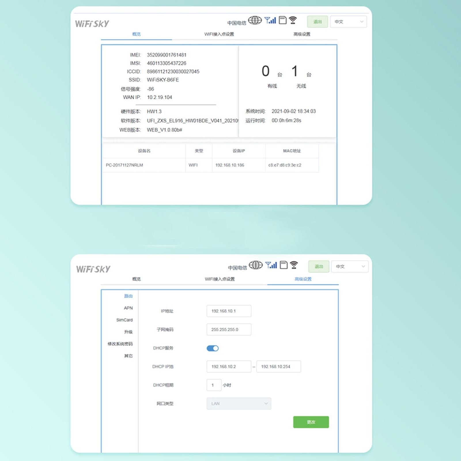 5. Connect WIFI, open 192.168.100.1 in the browser to enter the background, in the background can change the WIFI name and password to add APN.