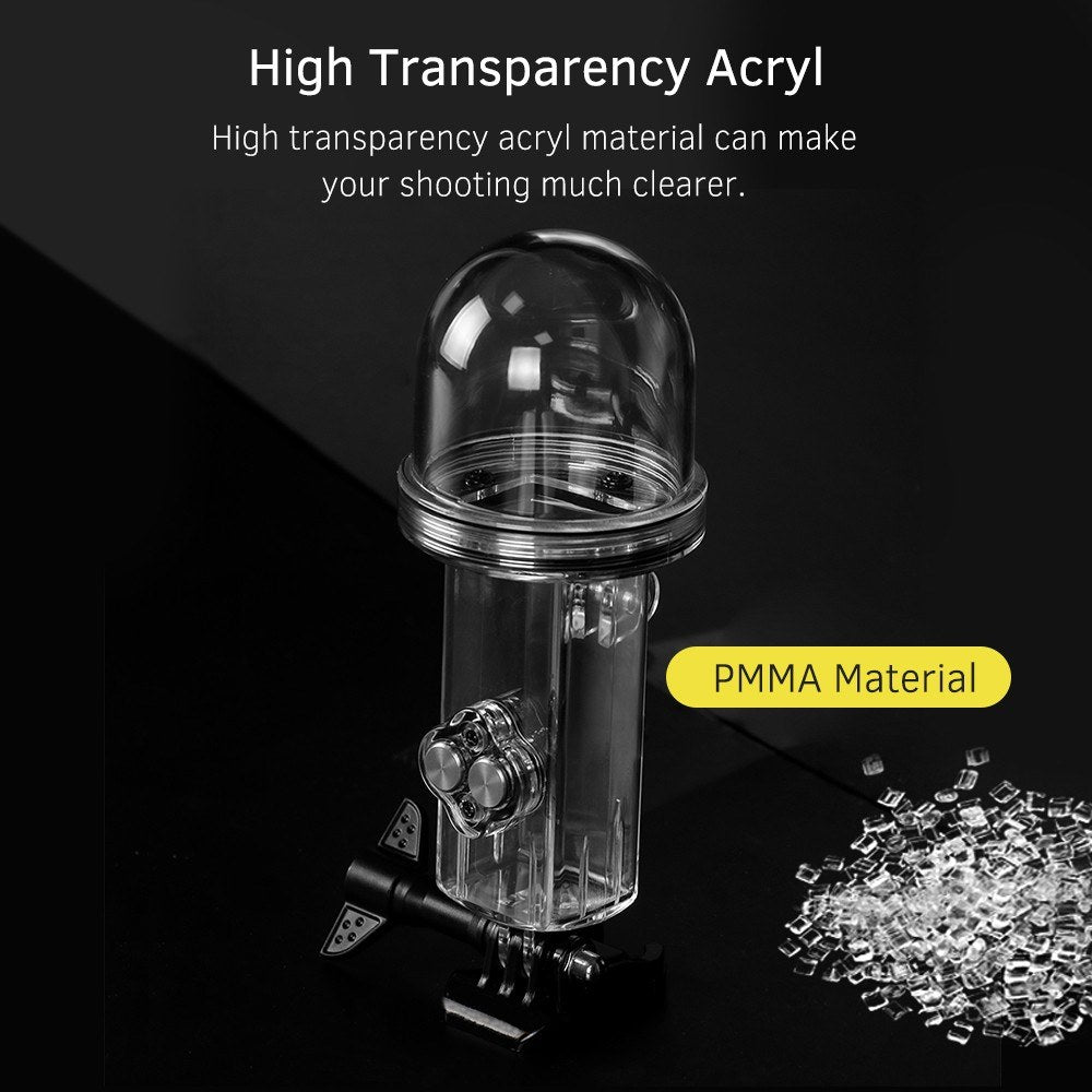 Two stainless steel operation buttons provide flexible and convenient underwater operation, with fine oxidation resistance, very durable. Main body is made of high transparency acryl