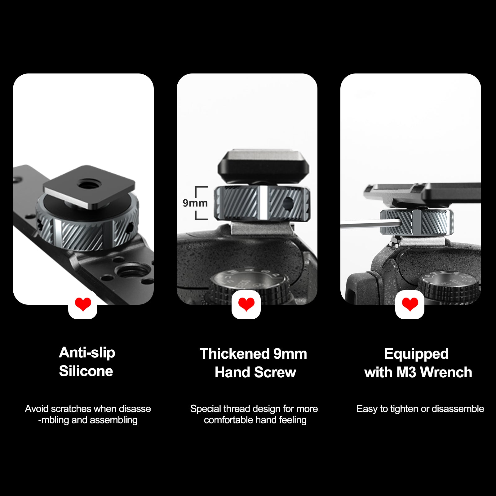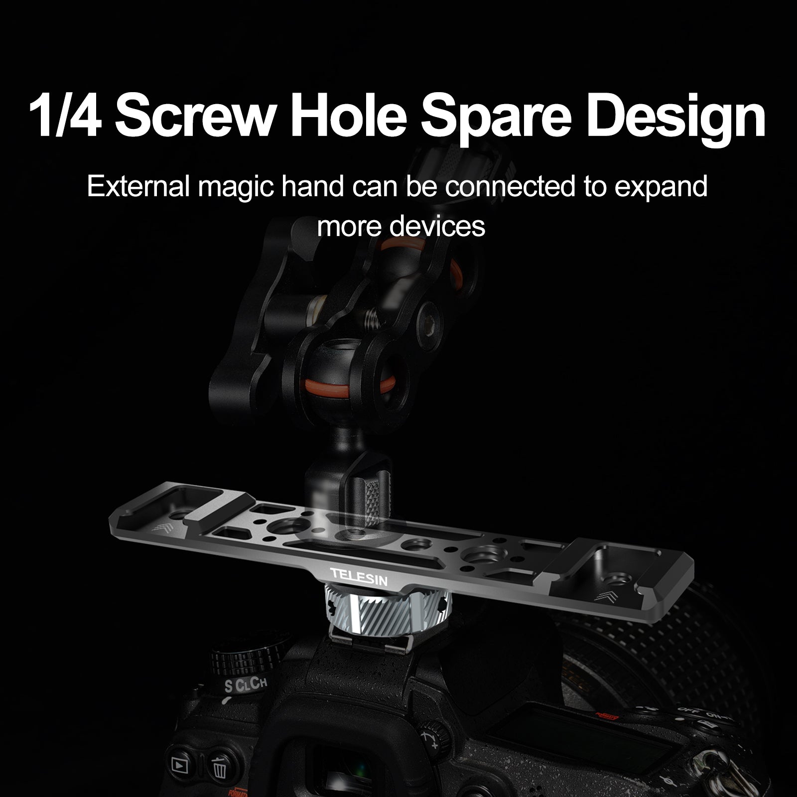 Designed with 2* cold shoe interface, 4* 1/4" screw thread hole, 2* 3/8" screw thread hole (with for Arca Swiss Positioning Hole)