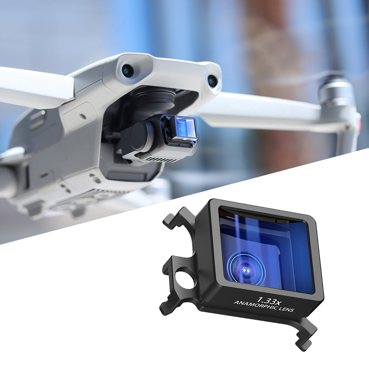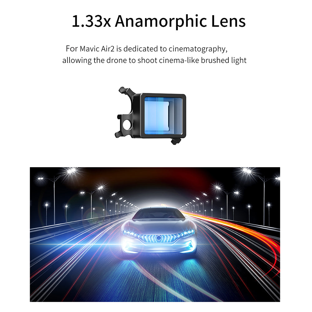 This anamorphic lens for Mavic Air 2 is dedicated to cinematography, allowing the drone to shoot cinema-like brushed light