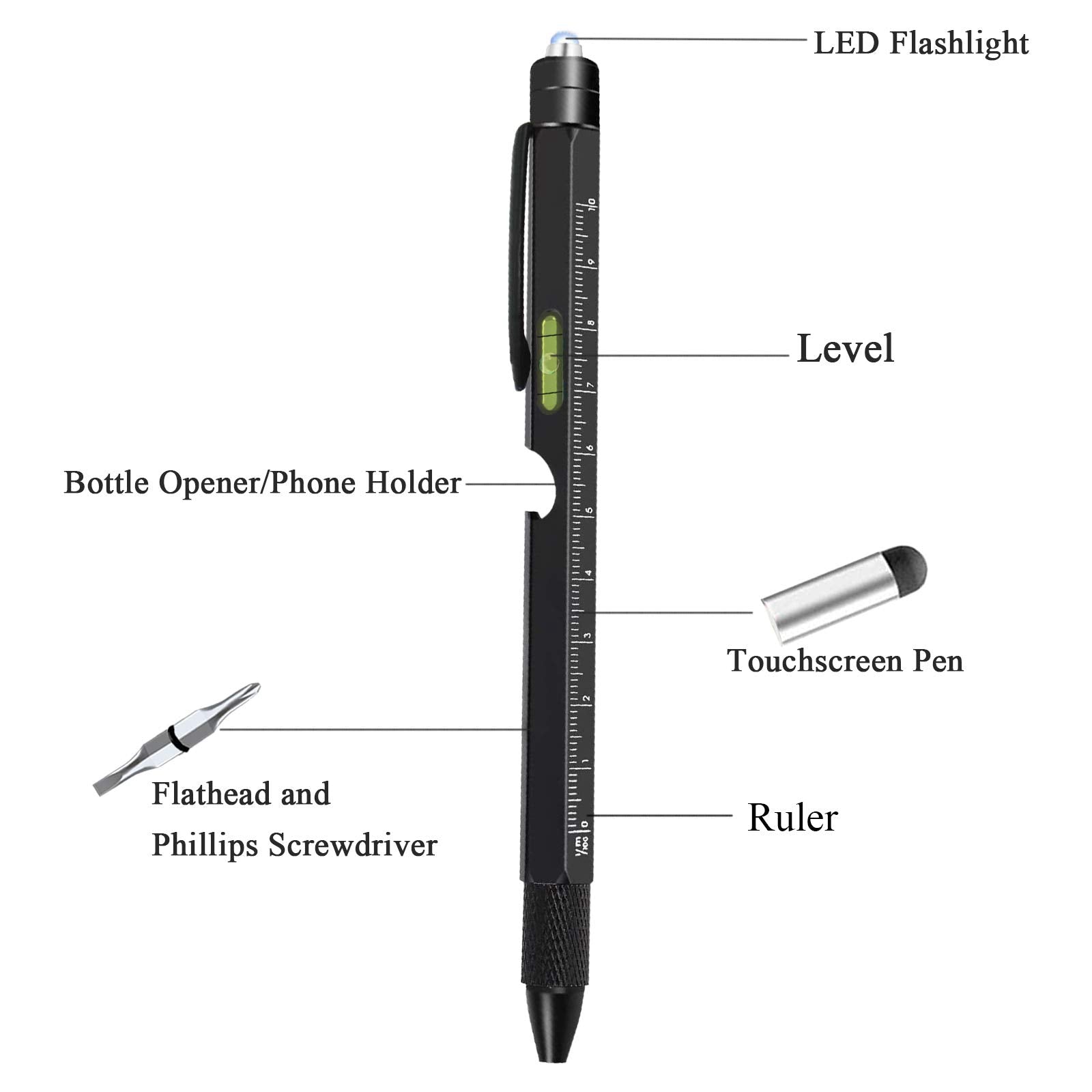 - 2Pcs Cool Gadgets Set for Men Gifts: With the two novelty pens (9 in1 and 6 in 1multitool pen) you get - bright LED light, screen stylus, standard and metric rulers, bubble leveler, flat head, and Phillips screwdriver, and a twisted ballpoint pen