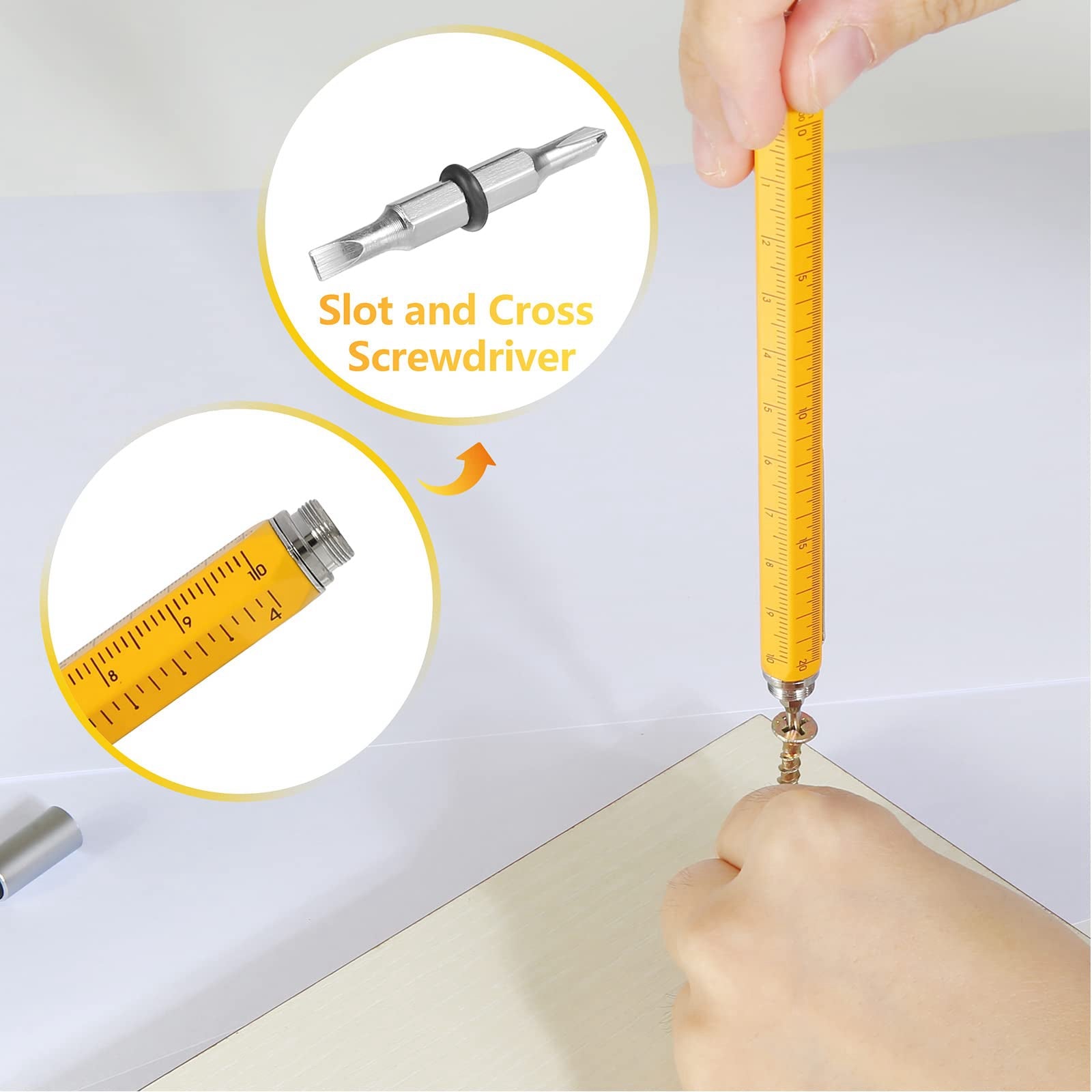 - Ruler & Bubble Leveler: Multifunction pen is not only a ruler with 4 scales(mm/inch), suit for most construction and other design drawings. Multifunctional Cool Pen built-in spirit level, can be used in many places, level up tripod, telescope, camera, leveling TVs, LCD mounts, adjust pictures/frame/murals, wall clocks, office desktop, can be professional measuring layout and normal usage