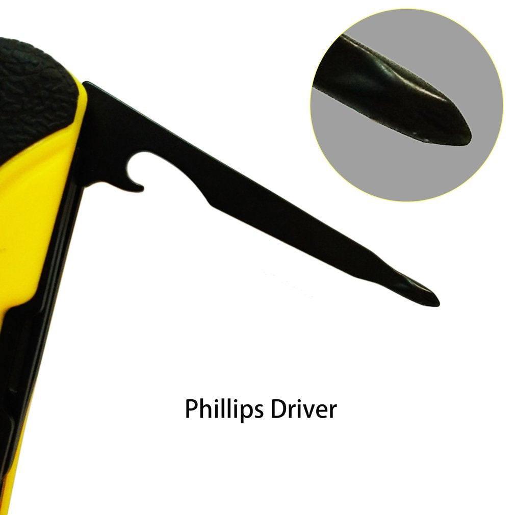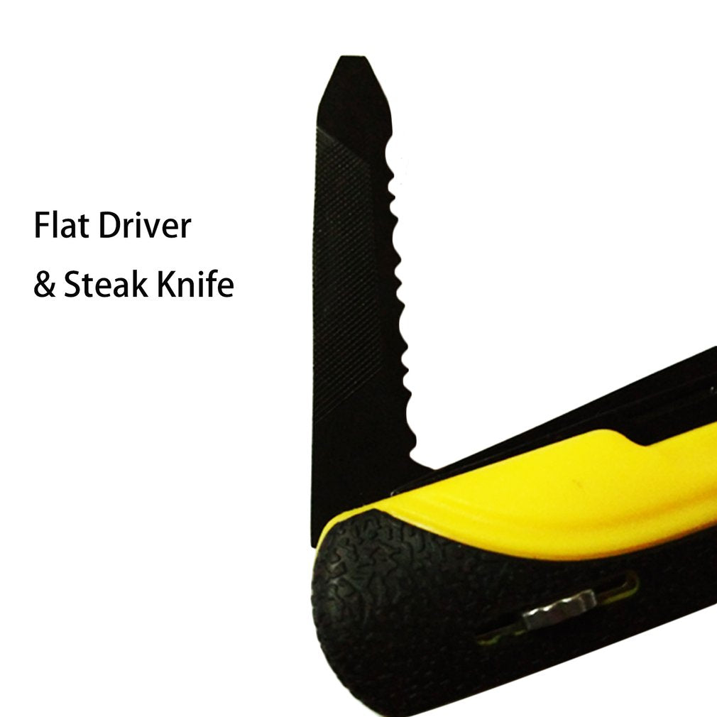 7-in-1 multitool, including hammer, pliers, screwdriver, knife, 2 saws and nail puller