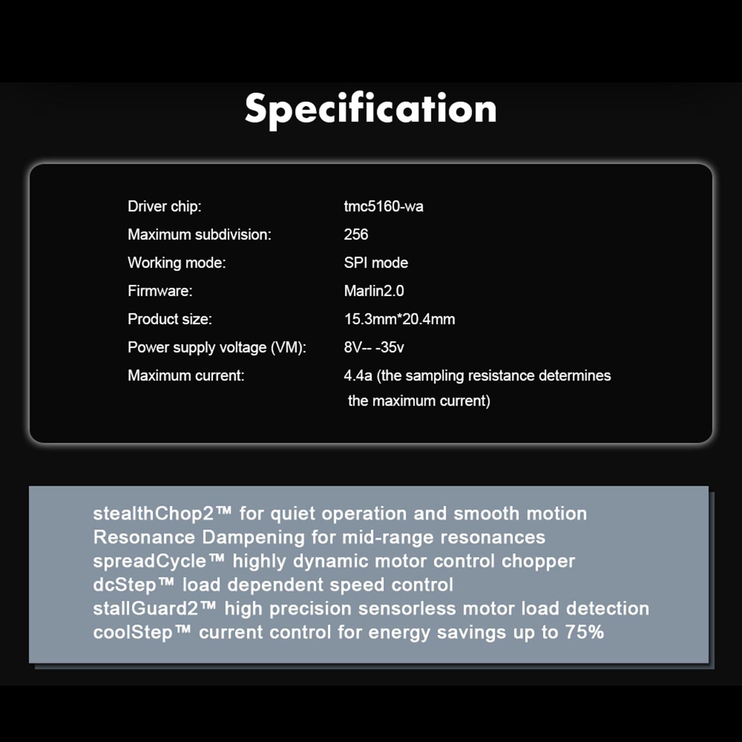 TMC5160 is a high-power stepper motor driving control chip which has externally expanded power MOS tube the maximum current can reach 20A low heat when working.Features:4PCS MOSFET-Low calorific value the maximum current can reach 20A.(because the module is limited by area the current cannot exceed 5A)Upgraded version of TMC5160 V1.2 the heatsink can completely cover 4pcs MOSFET.The TMC5160 V1.2 uses a 6-layer board which is more complete than the TMC5160 V1.1 signal and the work is more stable and the heat dissipation is better.Ultra-quiet avoid losing steps and jittering. Can drive 57 stepper motor.Only Support SPI working mode currently only firmware for Marlin 2.0 and above supports the TMC5160 SPI mode.Specifications:Quantity: 1pc/4pcs/5pcs/6pcs(optional)Driver Chip: tmc5160-waMaximum Subdivision: 256Working Mode: SPI modeFirmware: Marlin2.0Power Supply Voltage(VM): 8V-35VMaximum Current: 4.4a(the sampling resistance determines the maximum current)Item Size: 2.0 * 1.5cm / 0.8 * 0.6inPacking List:1 * Driver1 * Cable1 * Heat Sink