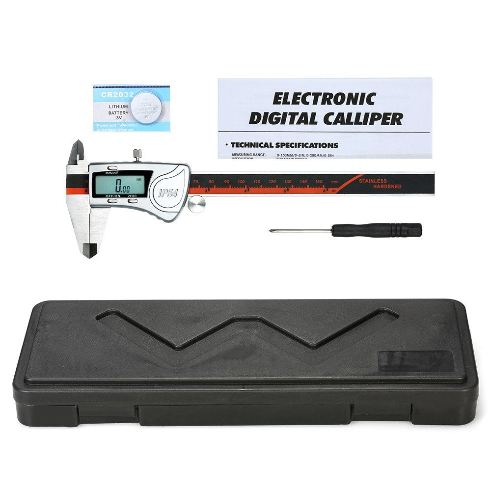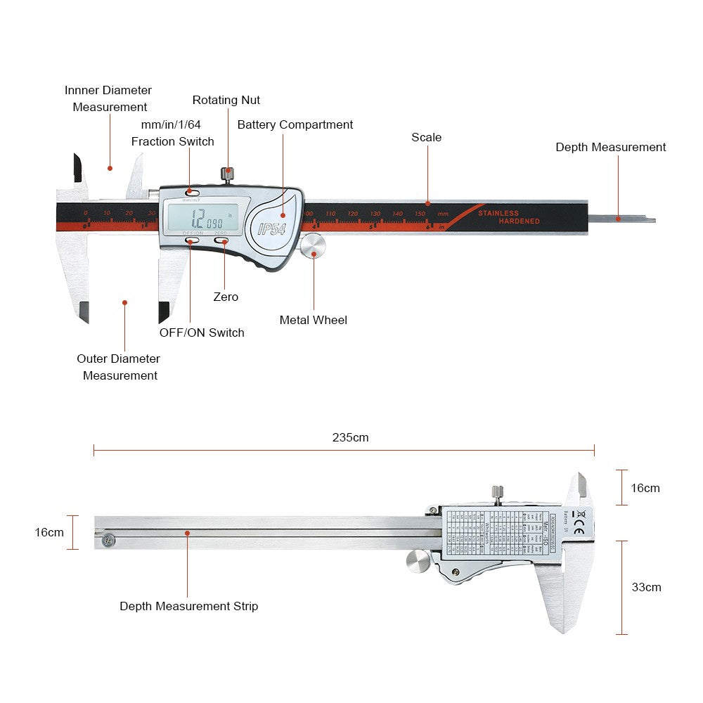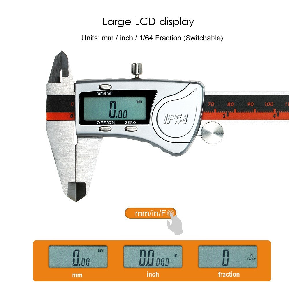 Large LCD display for easy reading. Measuring range is 0-150mm, resolution is 0.01mm/0.0005in