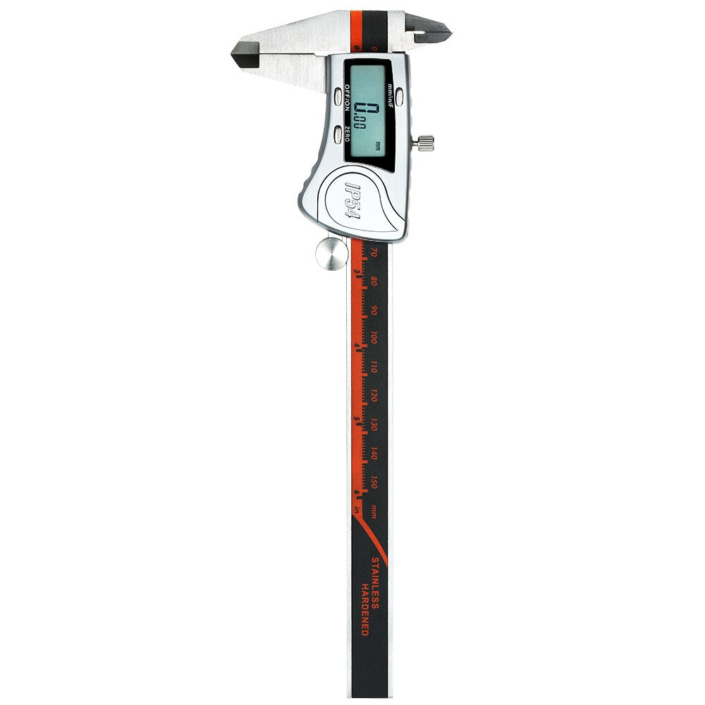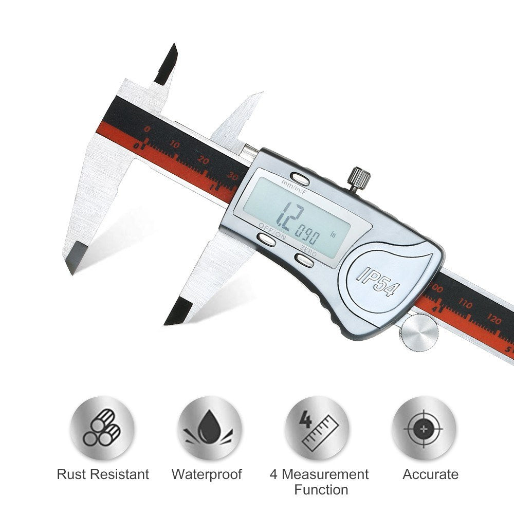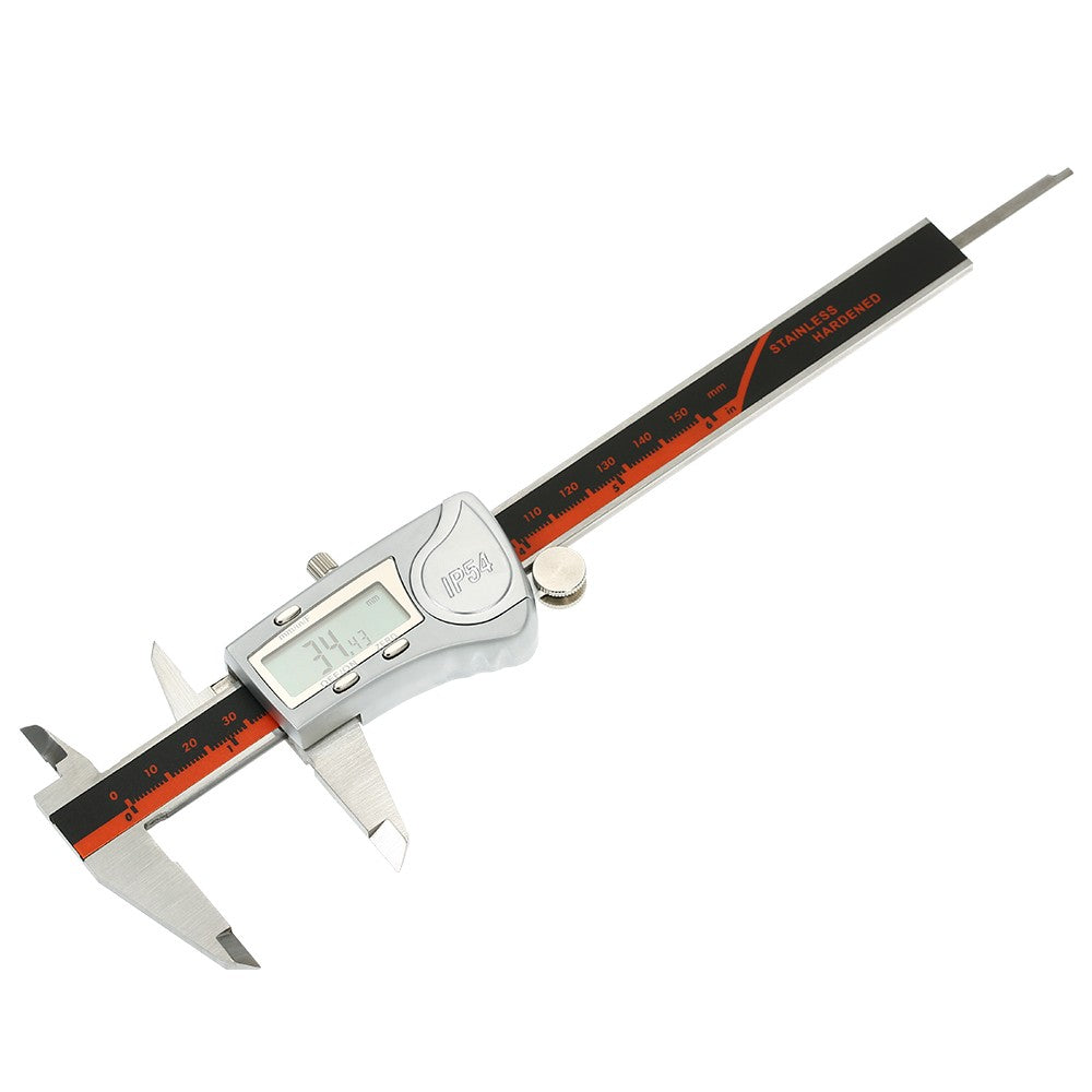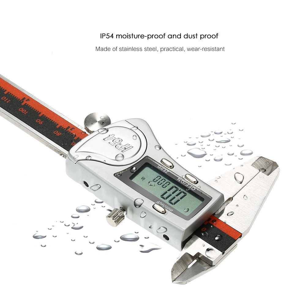 Large LCD display for easy reading. Measuring range is 0-150mm, resolution is 0.01mm/0.0005in