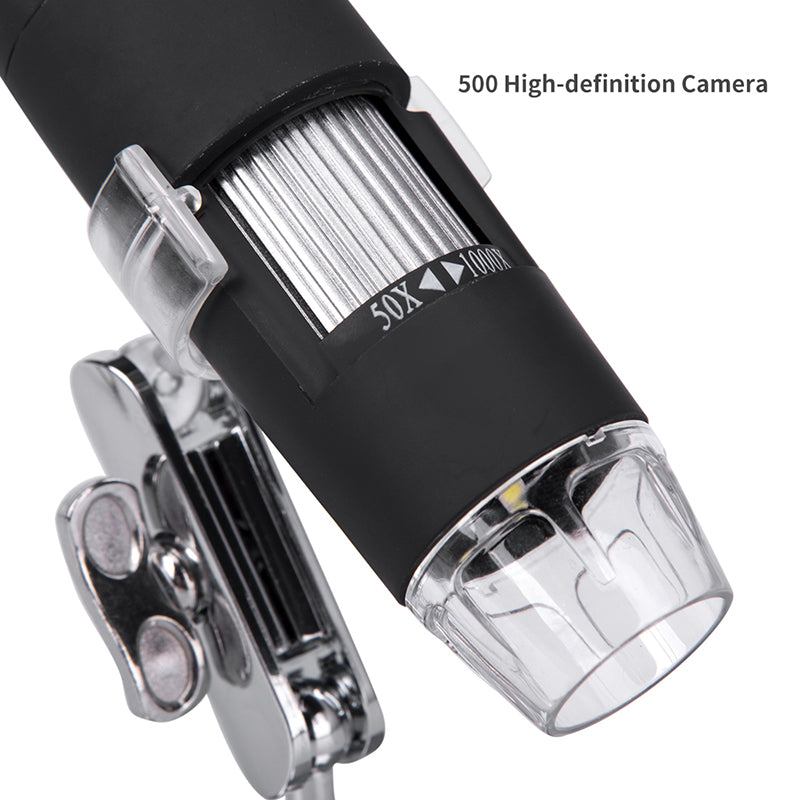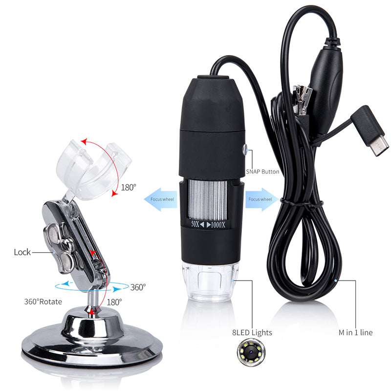 Built-in 8-LED lights, digital microscope's 2 adjusting knob can change the focus and brightness