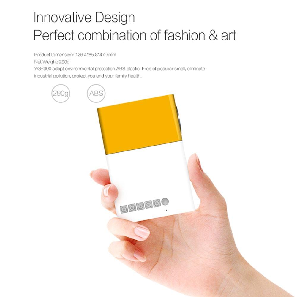 YG300 high-definition LED Projector is specially designed for Home Theater Entertainment Business Conference Education Training etc. Its physical (native) resolution is up to 320 * 240 Pixels and maximum resolution is up to 1920* 1080. It features compact portable size easy operation and long using life. Supporting a variety of Video Pictures and Music formats. And its 400 lumens for high-definition and bright images. It will bring you munch convenient and unexpected experience whether in your daily life in your work.Features:[Imaging System]Adopt Single Panel LCD Technology with 30000 hours of LED lifespan features 400 lumens brightness 800:1 contrast ratio design and 320 * 240 (WVGA) resolution supporting up to 1920 * 1080 (for a 1080P video-allowing you to watch your favorite movies in high definition).[Light and Compact Portable]Adopt light and compact portable design YG300 LED Projector owns palm size (13.0 * 8.5 * 4.5cm). Fit an entire home entertainment system in your pocket. You can easily carry it with you conveniently watching all your favorite movies or making an impressive business presentation anytime and anywhere.[Super Companion for Entertainment]Support multimedia formats (Videos Music Picture TXT) deal for movies and video game use. Light mini size easy to carry great company for home entertainment and travel use.[Adjustable Projection Distance Projection Size]Offer 20 ~ 60inches image size and 0.8m ~ 2.0m Projection Distance (Only can adjust the size of the image by change the distance). Giving you a clear frame and a projection size of up to 60 inches you also can select the optimal size of the image by adjusting the distance to obtain the best Use Experience.[Widely Compatibility]Equipped with HD USB AV Headphone jack and TF card slot easy to connect with Laptop PC USB disk TF Card etc. You can watch your favorite videos or movies with bigger screen via HD/USB/TF Card.Note: YG300 LED Projector NOT includes built-in battery but it is equipped with a micro USB charge port and charge switch. can be powered by Power Bank (Support 5V /1.5A portable power supply) which is just an auxiliary way of power supply. We suggest that you had better uses the included Power Adapter to power the LED Projector.Highlights:Imaging System: Single Panel LCDBrightness: 400 LumensOSD Menu Languages: English / Chinese etc. Supports 23 languages.LED Lamp Using Life: More than 30000 hoursAmazing LCD true color display technology3D function: Support Red-Blue format 3D Sources.Native resolution: 320 * 240 Pixels (SVGA).Support Resolution: Up to 1920 * 1080 Pixels (by HD).LCD Contrast Ratio: 800 : 1Projection Ratio: 1.6 :1Aspect Ratio: 4:3Color: 16.7MStandard Color Temperature: 6400KOperation: Manual Remote Controller (With Infrared Remote Controller Convenient to use).Projection Picture Size(Diagonal): Projection a true Dynamic image Up to 60 (20 ~ 60 Depends on the Protecting Distance)Protection Distance: 0.8 ~ 2m.Picture Zoom: Manual FocusProjection method :Front / Rear etc.Included HD port: Perfect for HD 1080p video decoding capabilitiesMedia Formats Supported:Video Formats: AVI ASF WMV TS MPG M2P MP4 FLV SWF VOB MKV DIVX XVID MOV RMVB RV 3GP DAT RM WEBM Ssif.Supports Audio Formats: MP3 WMA AAC OGG PCM M4A AC3 WAV CD AMR MP2 APE DTS FLAC MIDI.Supports Picture Formats: JPG JEP PNG BMP GIF TIFF PCX TGA EXIF FPX SVG PSD CDR PCD DXF UFO EPS RAW MPO.Text Read: Support TXT file and auto flip.Applications: Home theater Business conference Entertainment School training and so on.Specifications:Model: YG300Uniformity: ?85%Color Gamut: 100%NTSStandard Interfaces:I / O Interface: 1 * HD port; 1 * AV port; 1 * 3.5mm Earphone port; 1 * Standard USB port; 1 * TF Card Slot; 1 * Power Input port.Power Consumption: 24WPower Supply: Input: 100~240V 50/60Hz; Output: 12V / 1.5A.Color: WhiteMain item size: 13.0 * 8.5 * 4.5cm / 5.1 * 3.34 * 1.77inMain item weight: 245g / 8.65ozPackage size: 19.8 * 18.0 * 8.5cm / 7.79 * 7.0 * 3.34inPackage weight: 568g / 20.0ozPackage List:1 * YG300 LED Projector 1 * Power Adapter1 * 3.5mm to RCA AV Cable1 * Remote Controller1 * English / Chinese User Manual