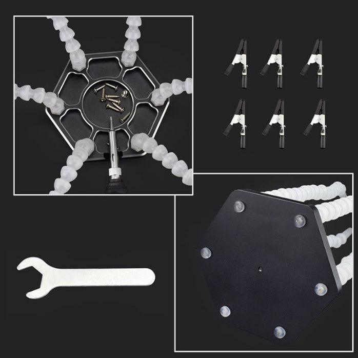 Six Adjustable Flexible Universal Arms: Six flexible helping hands, Universal joint pipe, easily positioned where you want them. Eliminates the frustration of traditional helping hands