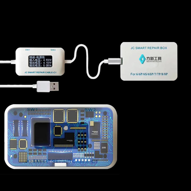 - Connect C1 to PC or USB adapter, then put the PCB in the correct location of the repair box, and then press SW2 for 3-second to boot on the PCB or phone.