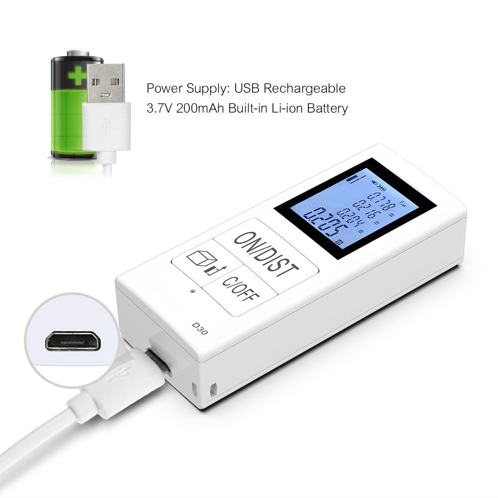 Want to own a pocket-size professional laser distance meter with higher precision? Try this super mini Laser Distance Meter. It can measure the distance, area and volume. It also can be used for indirect measurement by Pythagorean theorem. Simple in operation, accurate in measurement, super mini size for your palm, super light weight for easy carry. This USB rechargeable laser range finder, as a superior measuring tool can be widely used in construction and industries, especially in large areas such as rooms, apartments, buildings, real estates, factories, warehouses, etc.