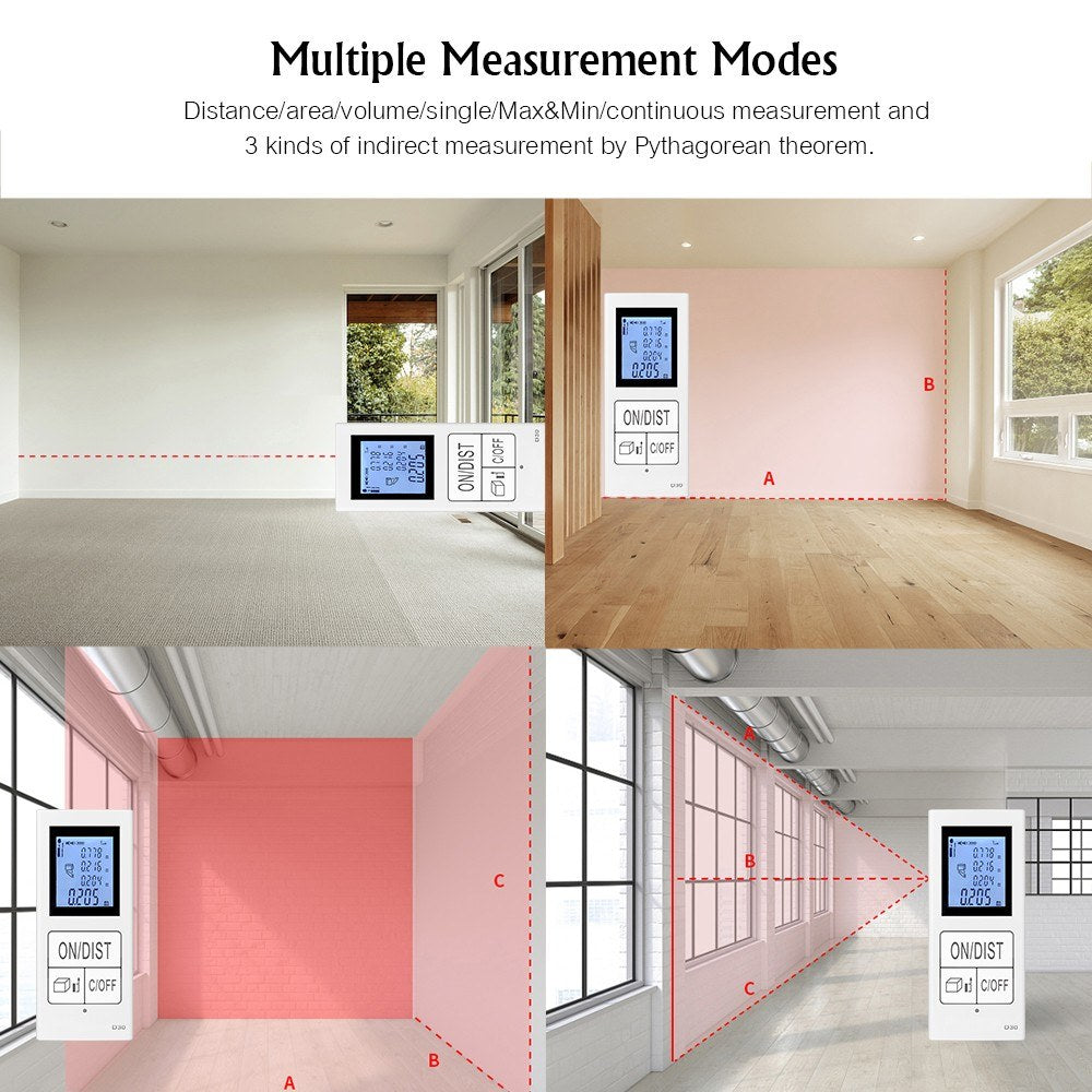 Multiple Measurement Modes: distance/area/volume/single/Max&Min/continuous measurement and 3 kinds of indirect measurement by Pythagorean theorem. Come with a hand strap and handheld design, convenient for carrying