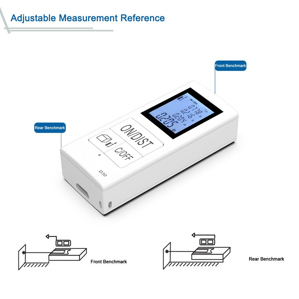Higher Accuracy: indicator for measuring datum mark/battery level/buzzer indicate/signal strength. Quick measurement of distance, area and volume with easy operation, 30m measuring range and high accuracy: ±3mm