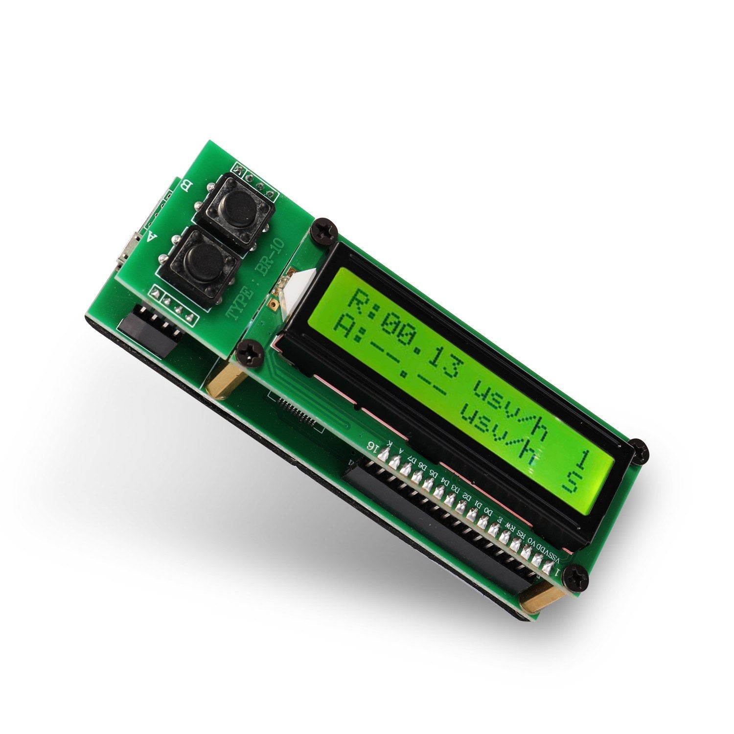 Powered by USB interface, you can use any USB port output recharger for power su-pply. The A button is used to select the sound mode, 1 is the granular sound mode (click-click), 2 is the alarm sound mode (alarm when the real-time value is greater than 0.5, beep-beep), 3 is the silent mode. The B button is used to starting the mean test function. When the average calculation is started, the second row of the LCD screen displays "--.--" and the average icon displays "s". After about 5 minutes, the average calculation ends and the second row displays the average result "xx.xx", and the average icon displays "o".
