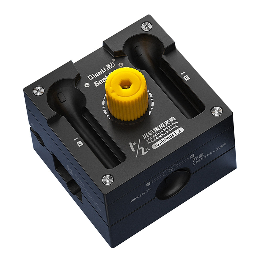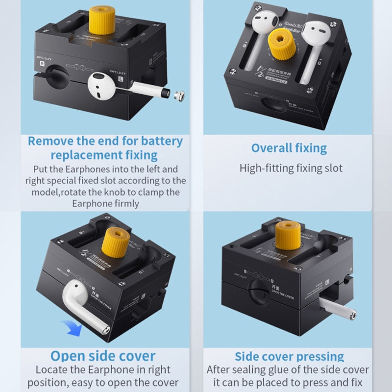 - Remove the end for battery replacement fixing: put the earphones into the left and right special fixed slot according to the model, rotate the knob to clamp the earphone firmly