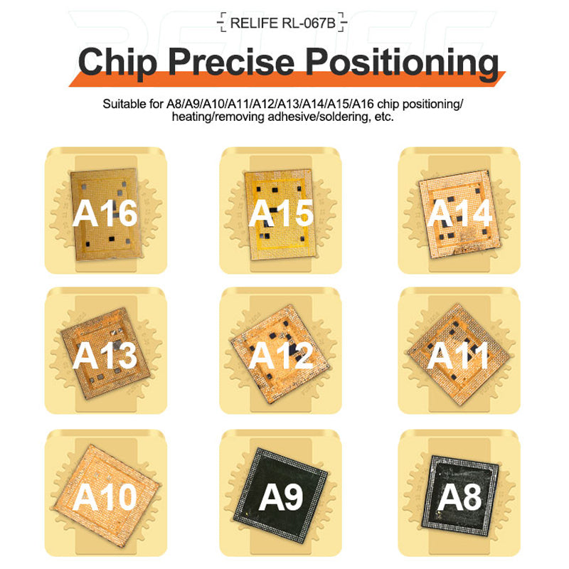 - Suitable for A8/A9/A10/A11/A12/A13/A14/A15/A16 chip positioning/heating/removing adhesive/soldering, etc.
