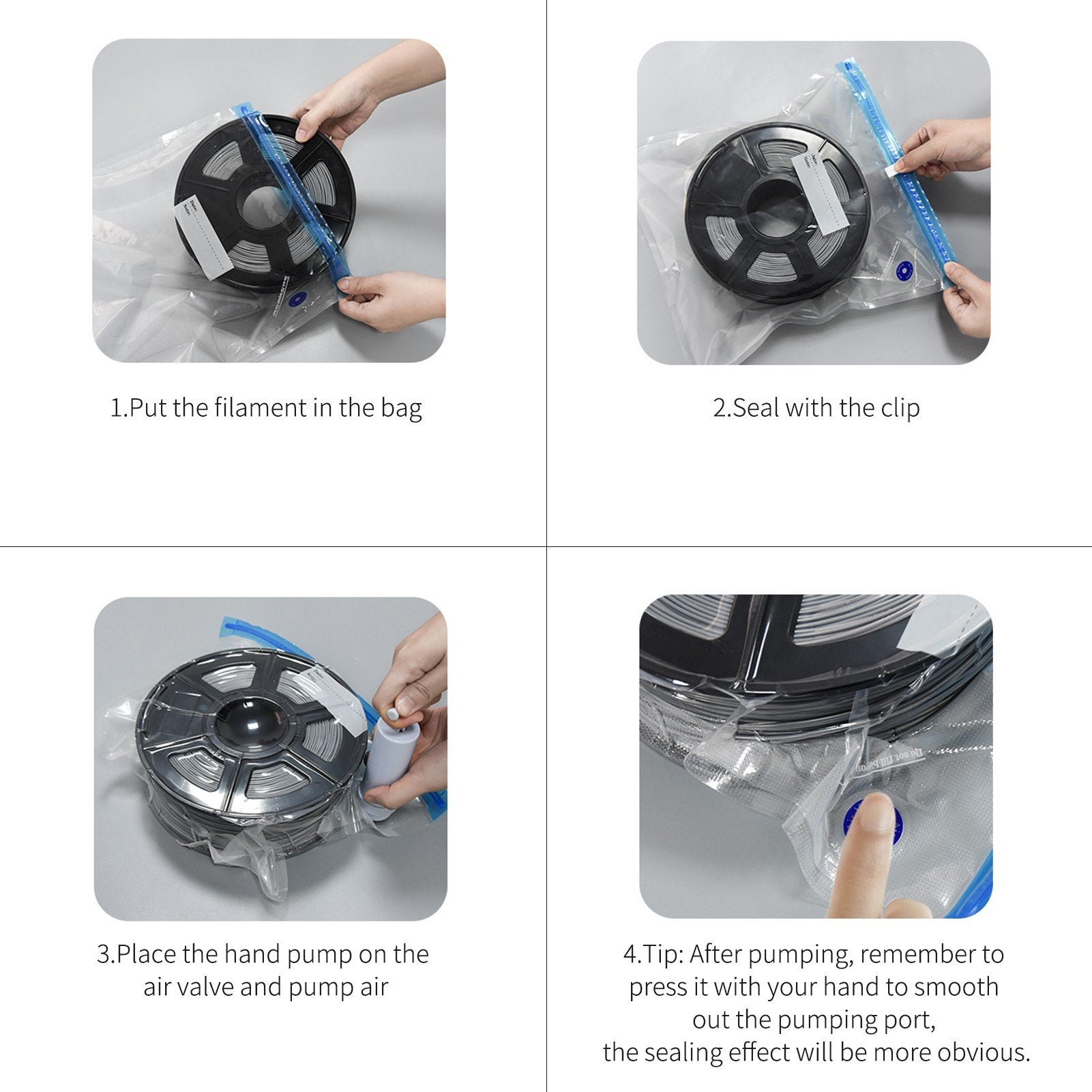 - Easy to Use: Put your filament in the bag, lock the zip lock seal with a sliding clip, keep the exhaust port on a flat platform, exhaust the air with the pump, Press the tape to ensure no air leakage.