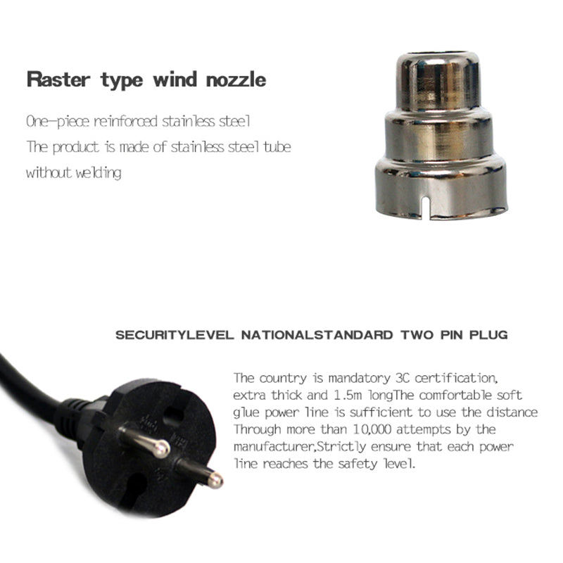 - 3C certificated national standard 2-pin plug, extra thick and 1.5m long power cable is sufficient to use