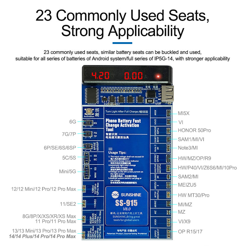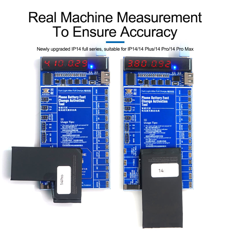 This is a battery fast charge activation fixture for iPhone 5-14 series and all series of Android smartphones such as Samsung/Huawei/oppo/vivo/Xiaomi/Meizu, which is compatible with multiple styles and models, supporting one-key battery activation, voltage detection, overcurrent protection, short circuit detection and high-current smart fast charging IC upgrade.