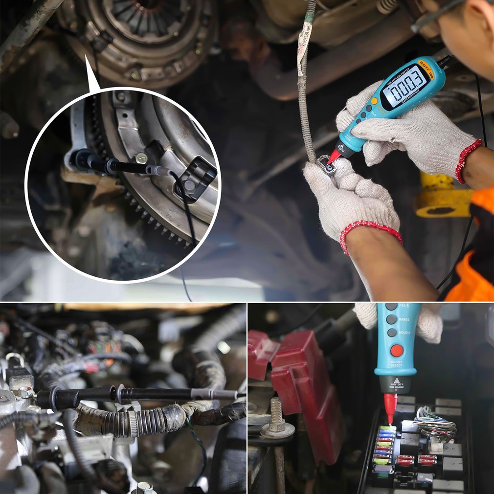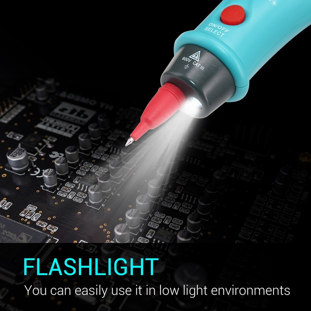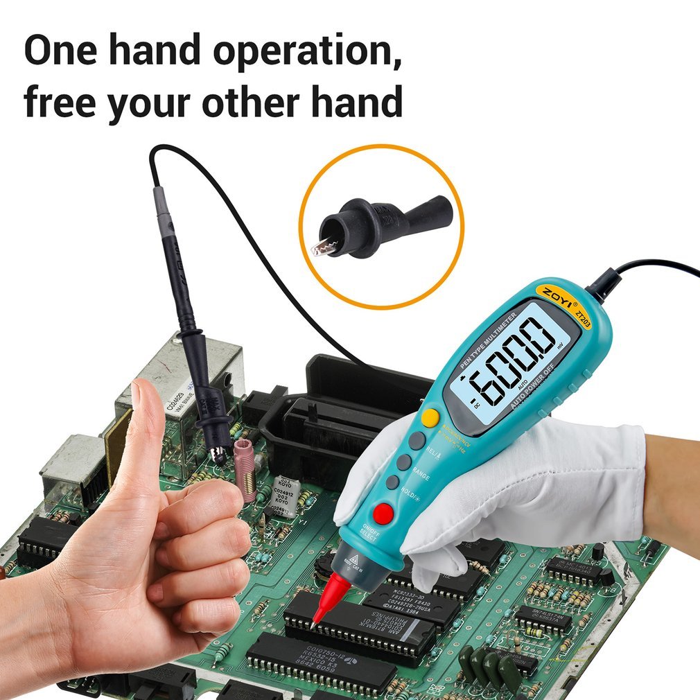 Auto-ranging pen-type digital multimeter with a 6000 counts LCD display and a backlight.