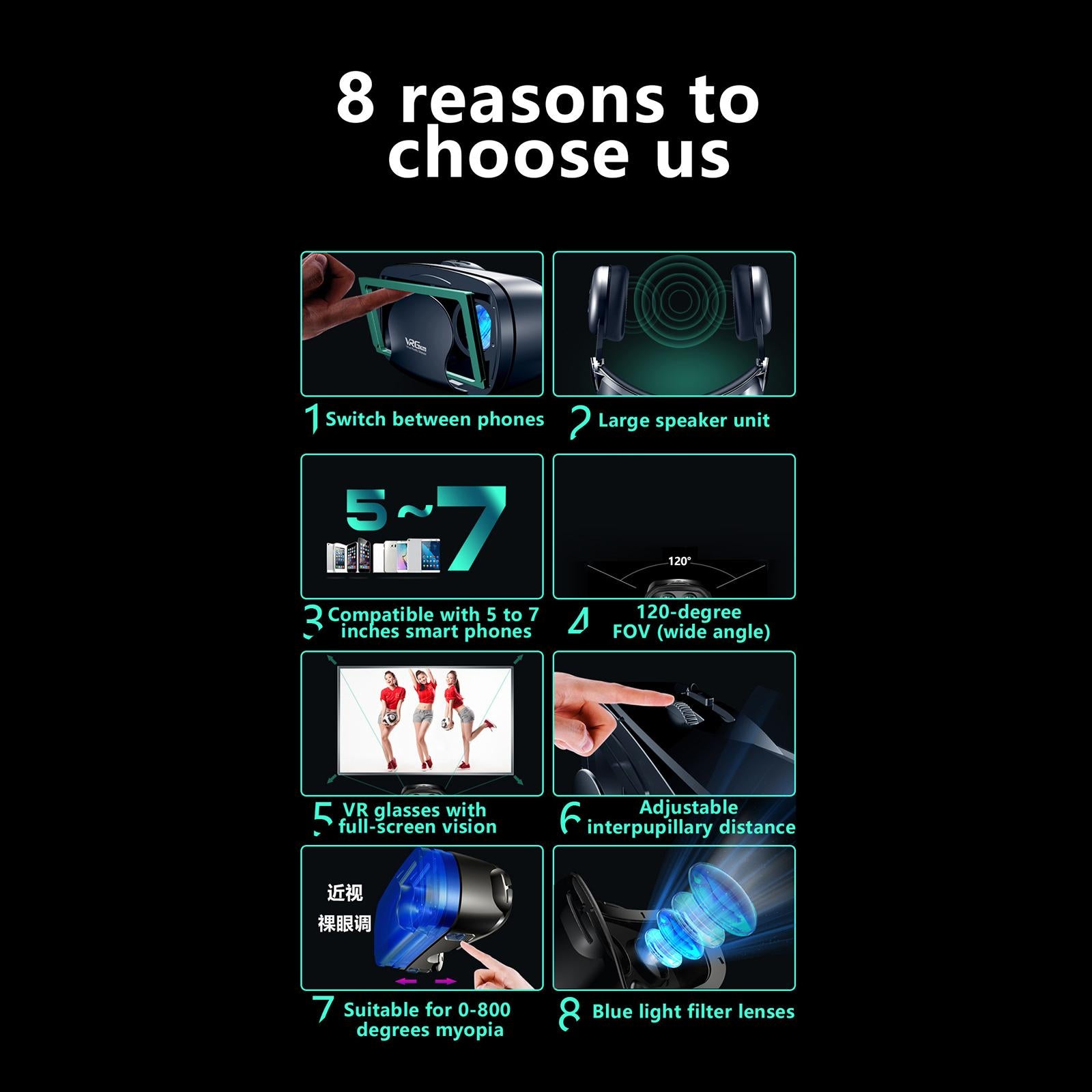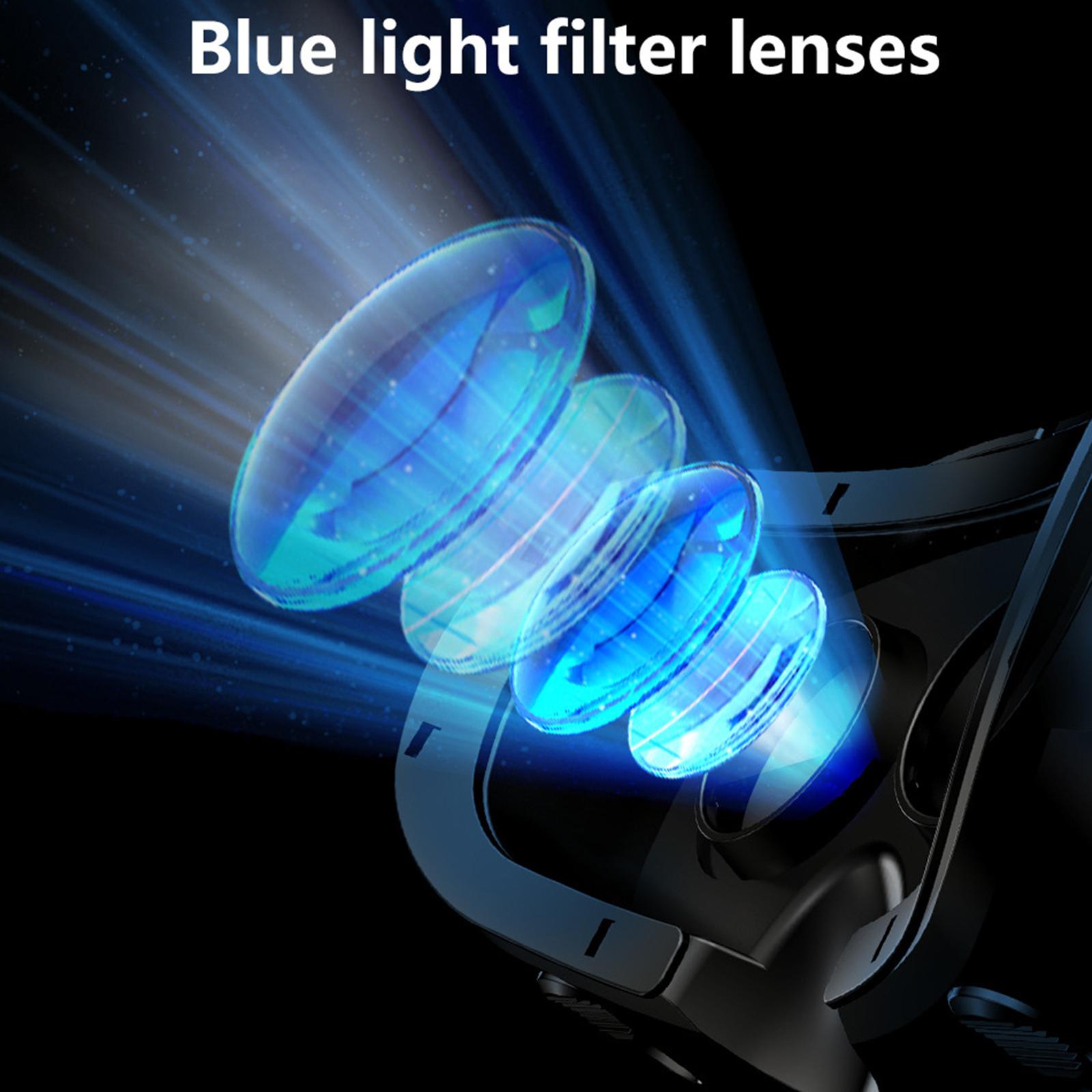 Myopic People Available: Object distance, IPD, one button adjustable. Myopia support, two eyes 1- 800 degree can be adjusted independently. Blue light coated lenses, 120-degree wide-angle field of view, full-screen vision viewing effect.