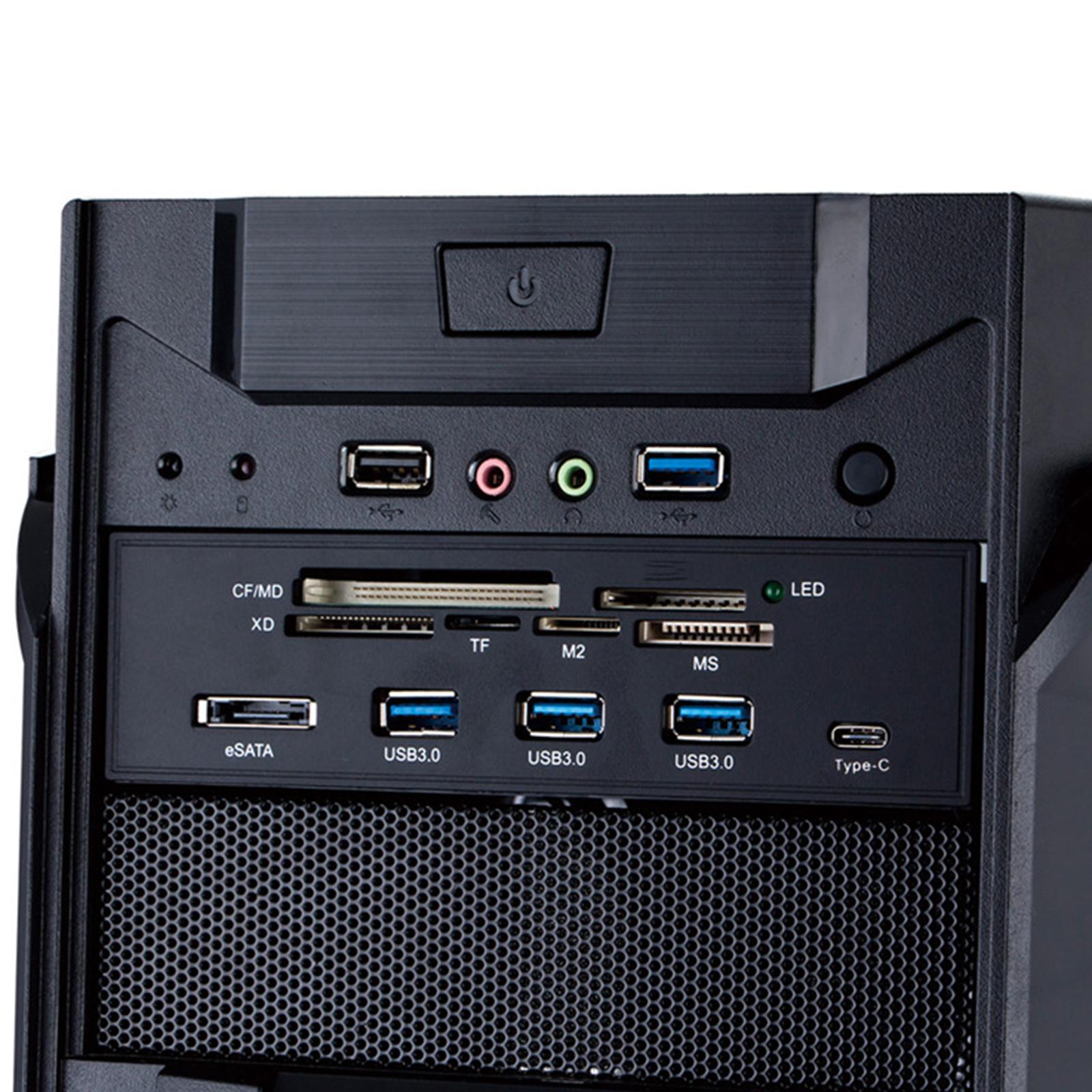 Front panel with three front USB Type-A ports, one front USB 3.1 Type-C port, one front eSATA port, and high speed card reader.