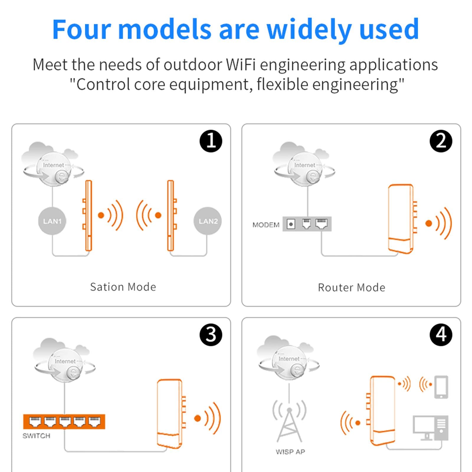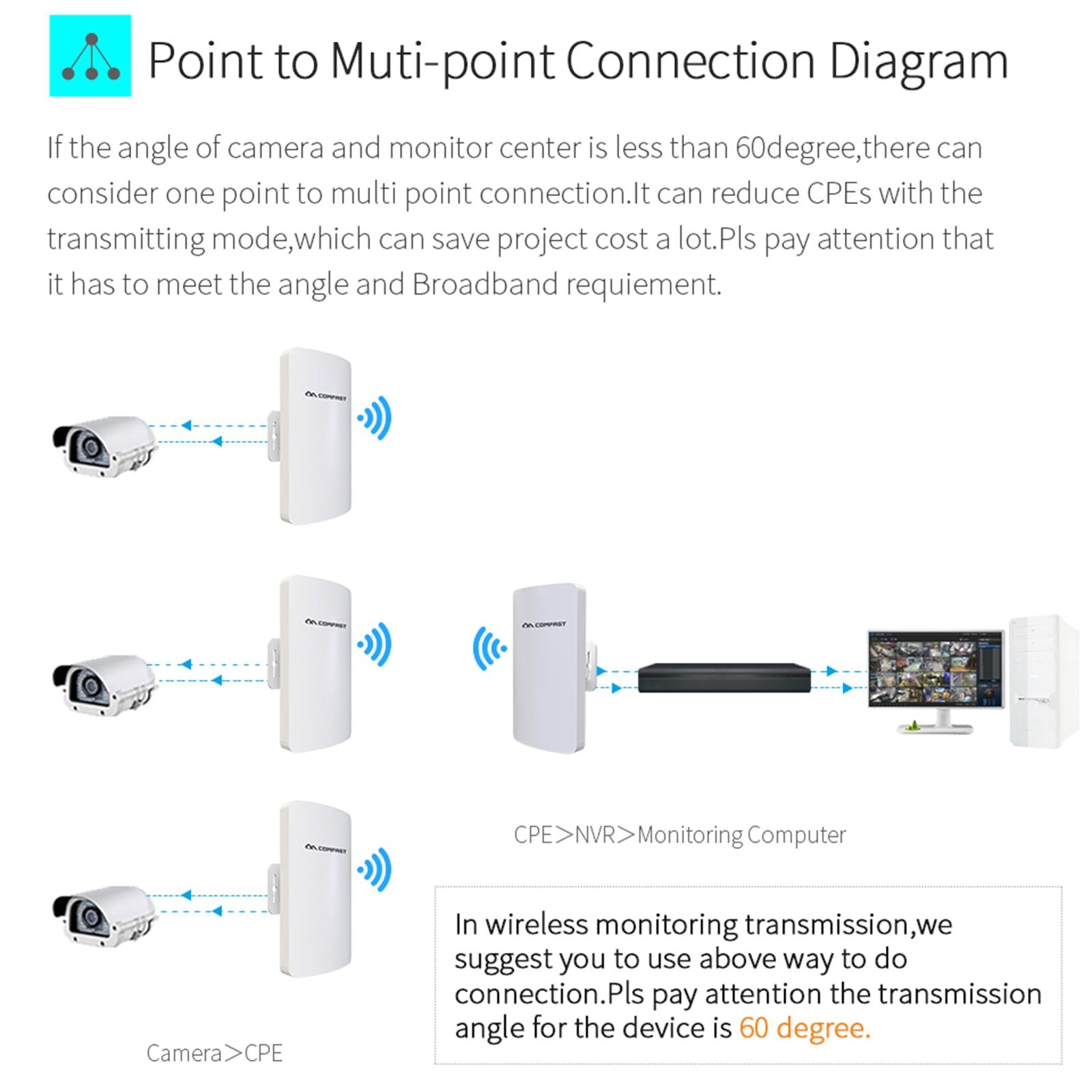 Suitable for long range video transmission point to point wifi cover, It support Wireless AP, Wireless Repeater, Bridge mode, default Pre-program WDS mode ,no need seting , it can work two unit at the same time , no need long cable for connect to camera with your PC