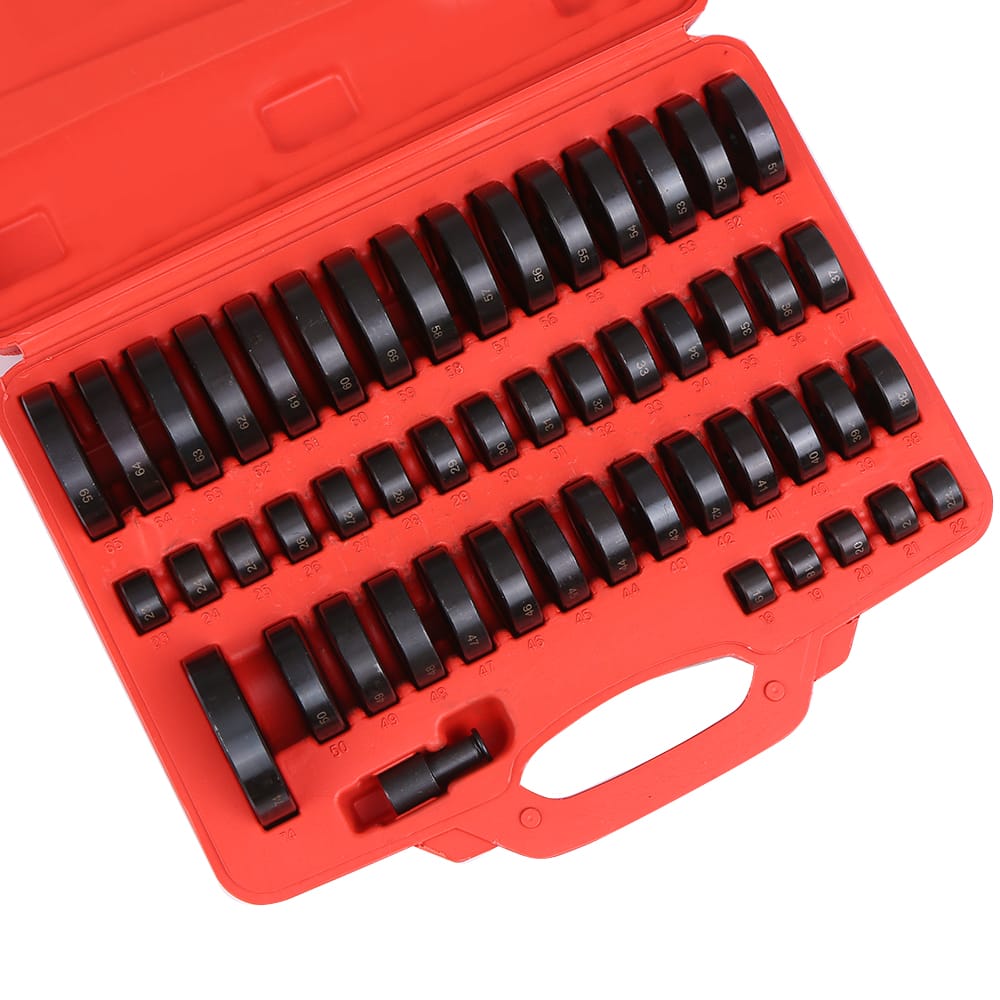 Suitable for mounting of wheel bearings sealing rings and rubbers. Particularly useful when using with hydraulic presses.Features:Master deluxe custom bush bearing and seal driver.The discs go from 18mm (25/32) all the way to 65mm (2-9/16) in 1mm increments plus 2-29/32 74mm.All discs are connected with a 12mm shaft and screw which quickly connects to a 180mm 7-1/2 handle.All 52pcs are interchangeable with each other so you get 2450 different size variations.Blow mold case for storage.Specifications:Material: carbon steelQty: 52pcsIncluding: 18 to 65mm (1mm steps) and 74mm 12mm bore 180mm metal handle for use with hammerPackage Weight: 7.94kg / 17.5lbPackage Size: 340 * 230 * 80mm / 13.39 * 9.06 * 3.15inNotes:1. Please allow 1-10mm error due to manual measurement thanks for your understanding!2. Item color may show slight aberration due to different shooting light and monitor display.Packing List:1 Set * Car Repairing Set