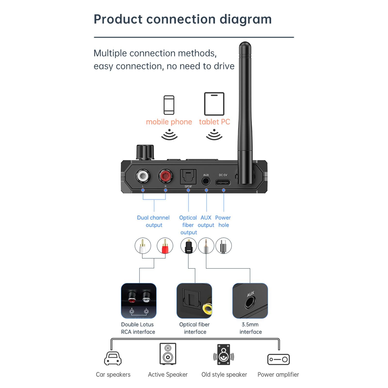 【Audio Receiver and Transmitter】Audio Adapter with rich interfaces like 3.5mm AUX , RCA right and left, optical fiber , support reading U disk playback, plug and play, no driver required, versatile design to meet the needs of different devices