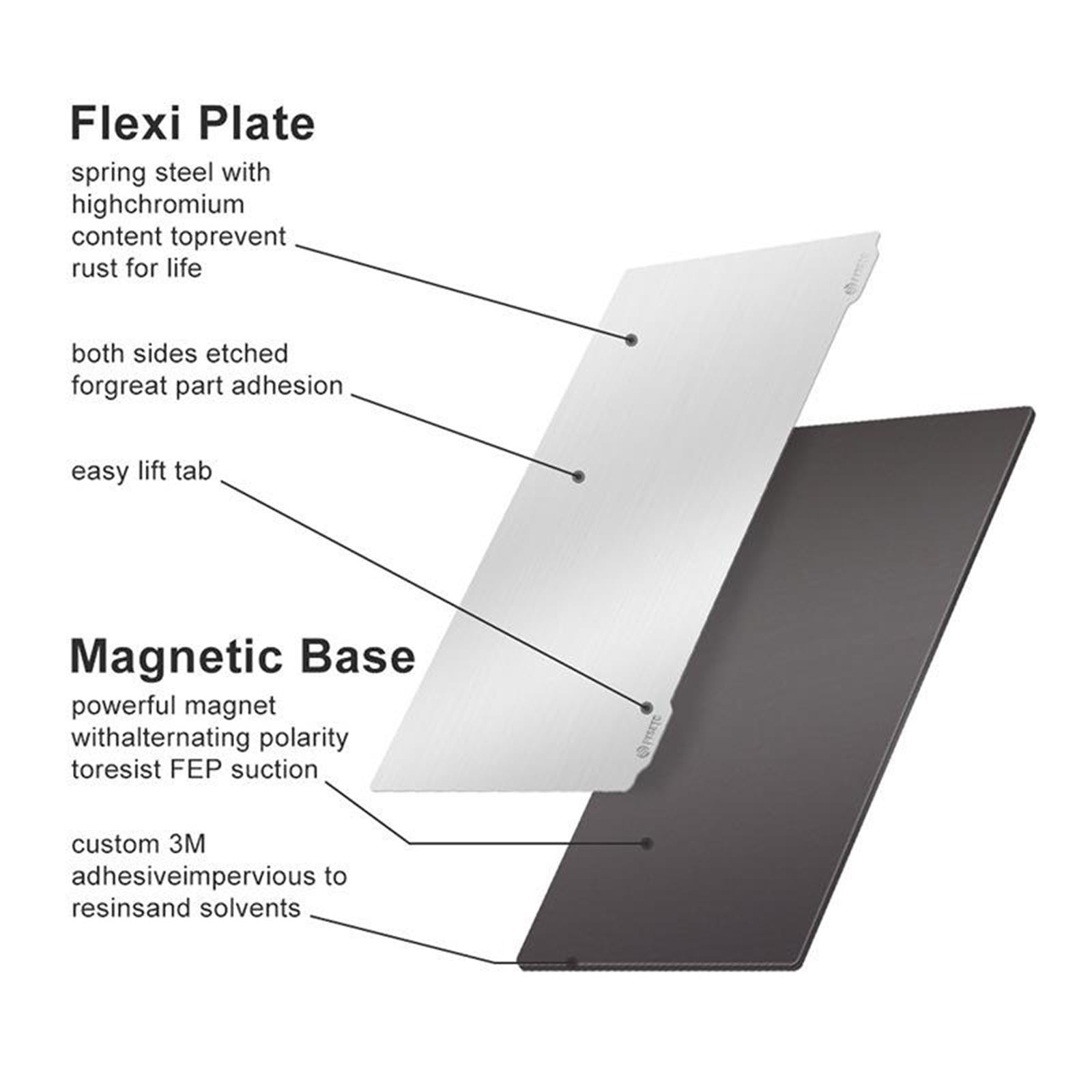 Flexible steel plate with high chromium content, easy to bend and clean. Much easier to remove prints and avoid damages during the process, especially for small prints.