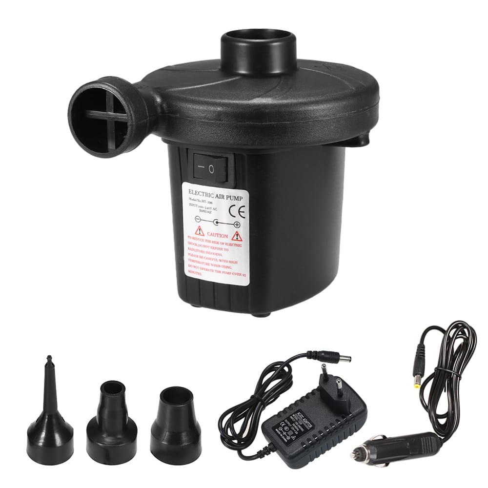FeaturesWith 3 Nozzle Sizes for optional can apply to any size of air cushion.Quick Air filling this portable electric air pump works fast to fill up your air cushion in the shortest possible time.Portable with light weight small body this electric air pump easy to pack and transport will take less space. Perfect for camping festivals or taking on holiday.Wide use this air pump can be used with airbed air mattress inflatable poolboatsofabathtubwater bedswim rings ect.High pressure the pressure is 5000mpa/0.8psi which is much higher than most others in the market.SpecificationsType Electric Air Pump(EU)Color BlackMaterial ABSPlug?EU PlugPressure 5000mpa 0.8psiAirflow 480LmimNoise 85dBPackage Weight: 367.7g/12.97ozPackage Size: 13.5*11.5*11cm/5.3*4.5*4.3inchPackage List1* Electric Air Pump1* Car Charger Cable1* EU Charger Cable3* Detachable Nozzles