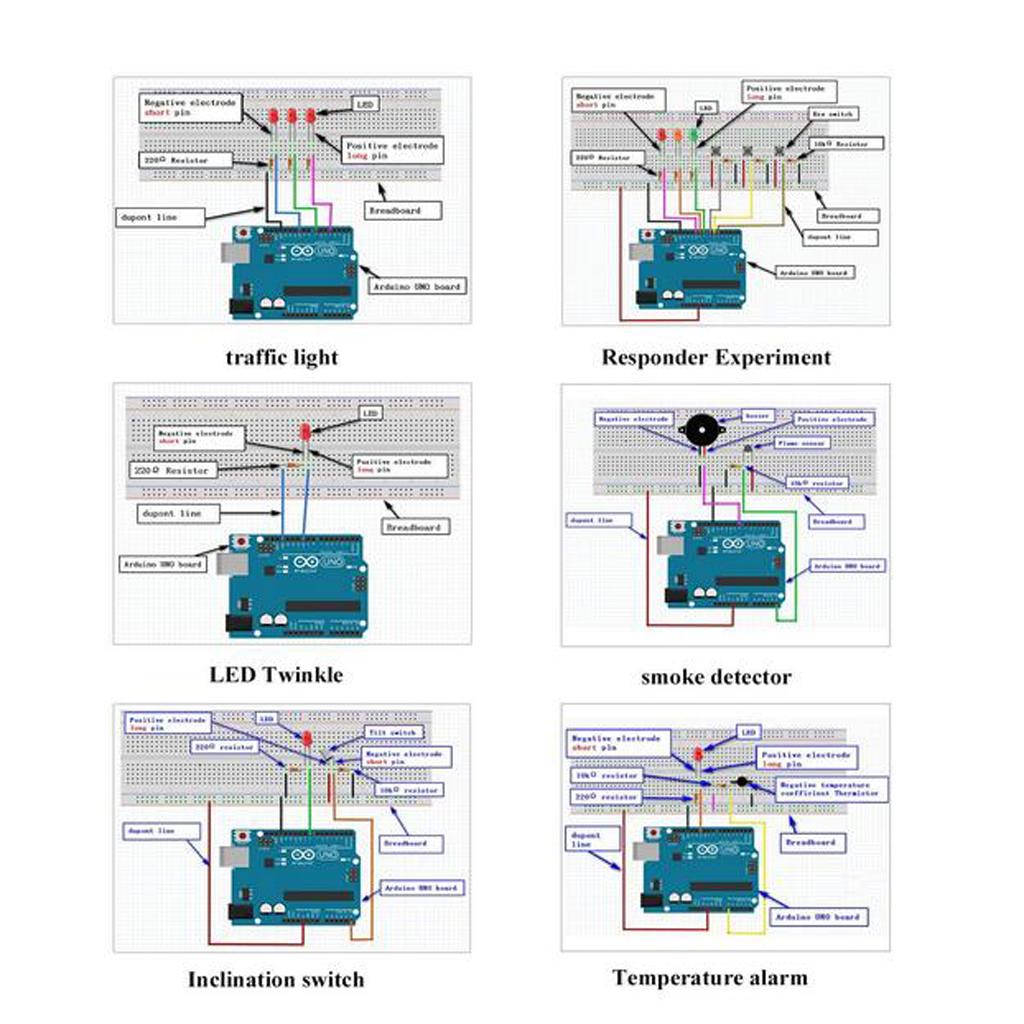 Input: Flame sensor, Photosensitive sensor, thermistor, IR remote receiver, Buttons, Adjustable resistor, Tilt sensor, Temperature and humidity sensor, sound detection sensor, Joystick, Gas sensor, touch sensor, PIR motion sensor, Ultrasonic sensor, Gray sensor