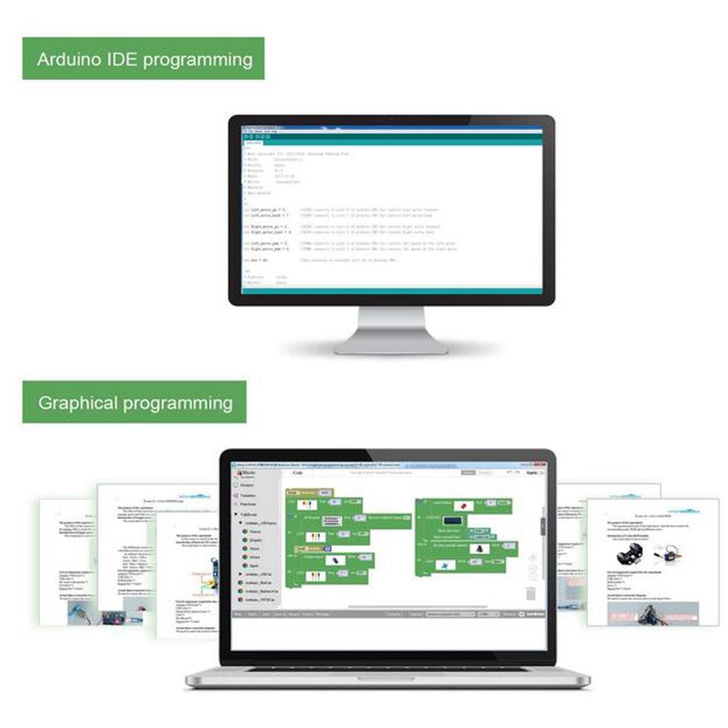 Users can use the C language programming by Arduino IDE and Graphical programming by Mixly.With Graphical programming, you can implement the features you want very quickly, even if you are Zero . With C language programming, you can learn simple code then go deeper into editing more different programming.