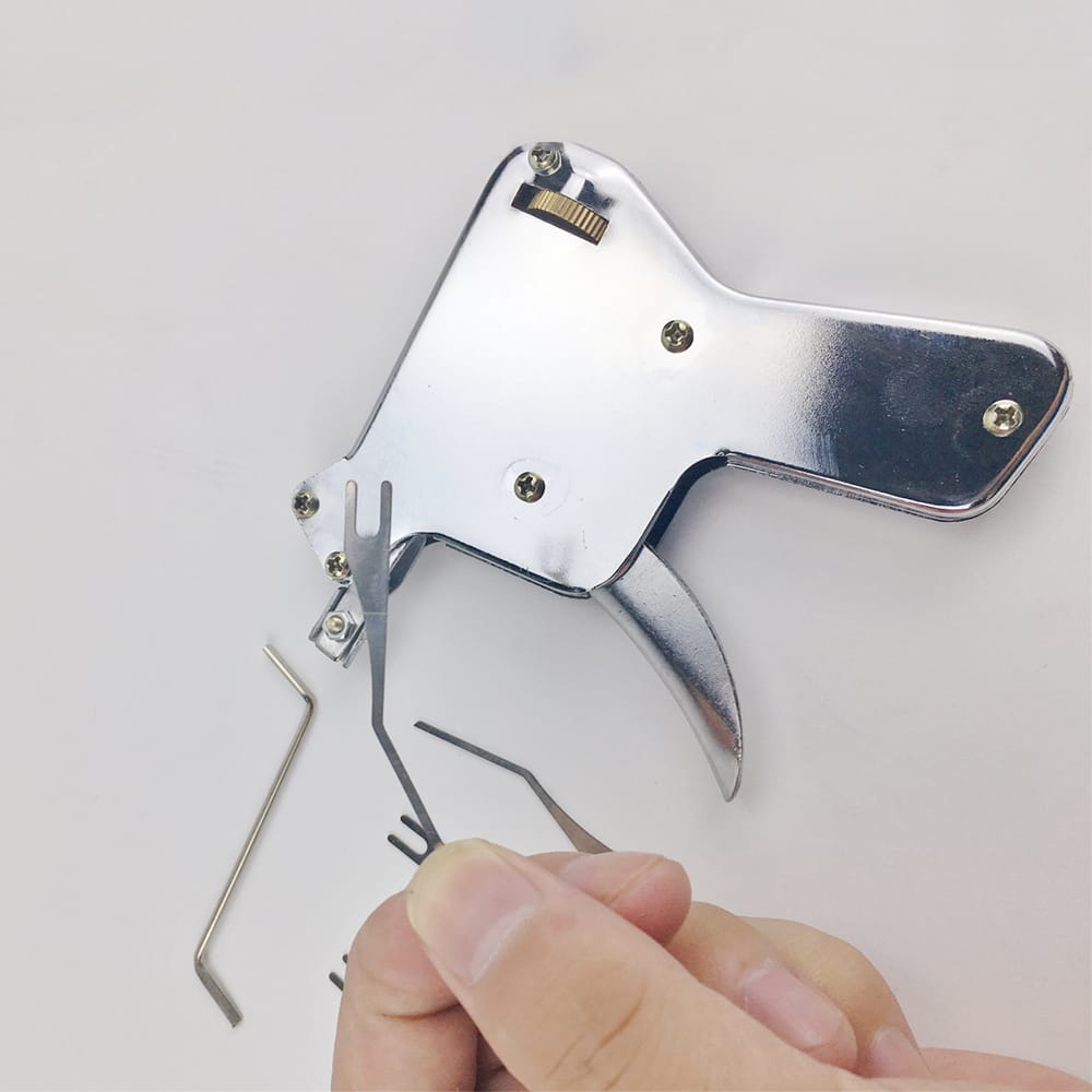 The strong lock opener with accessories are practical to open most of locks strong spring and jump tip easily open lock.Features:Lock pick pistol can be used to open most of pin tumbler locks double track car locks.With strong jump tip and big adjustable extent.Strong lock opener pistol has a very strong spring which could easily pick pin tumbler and disc tumbler locks.It comes complete with 4 pick blades and 1 tension wrench.The coating of pistol consists of lacquer can resist stain and rust.Suitable for both daily life use and professional locksmith or lock opener hobby.Specifications:Material: SteelColor: SilverPackage Weight: 184g / 6.49ouncesPackage Size: 120 * 110 * 14mm / 4.72 * 4.33 * 0.55inPackage List:1 * Strong Lock Opener1 * Tension Wrench4 * Open Blade