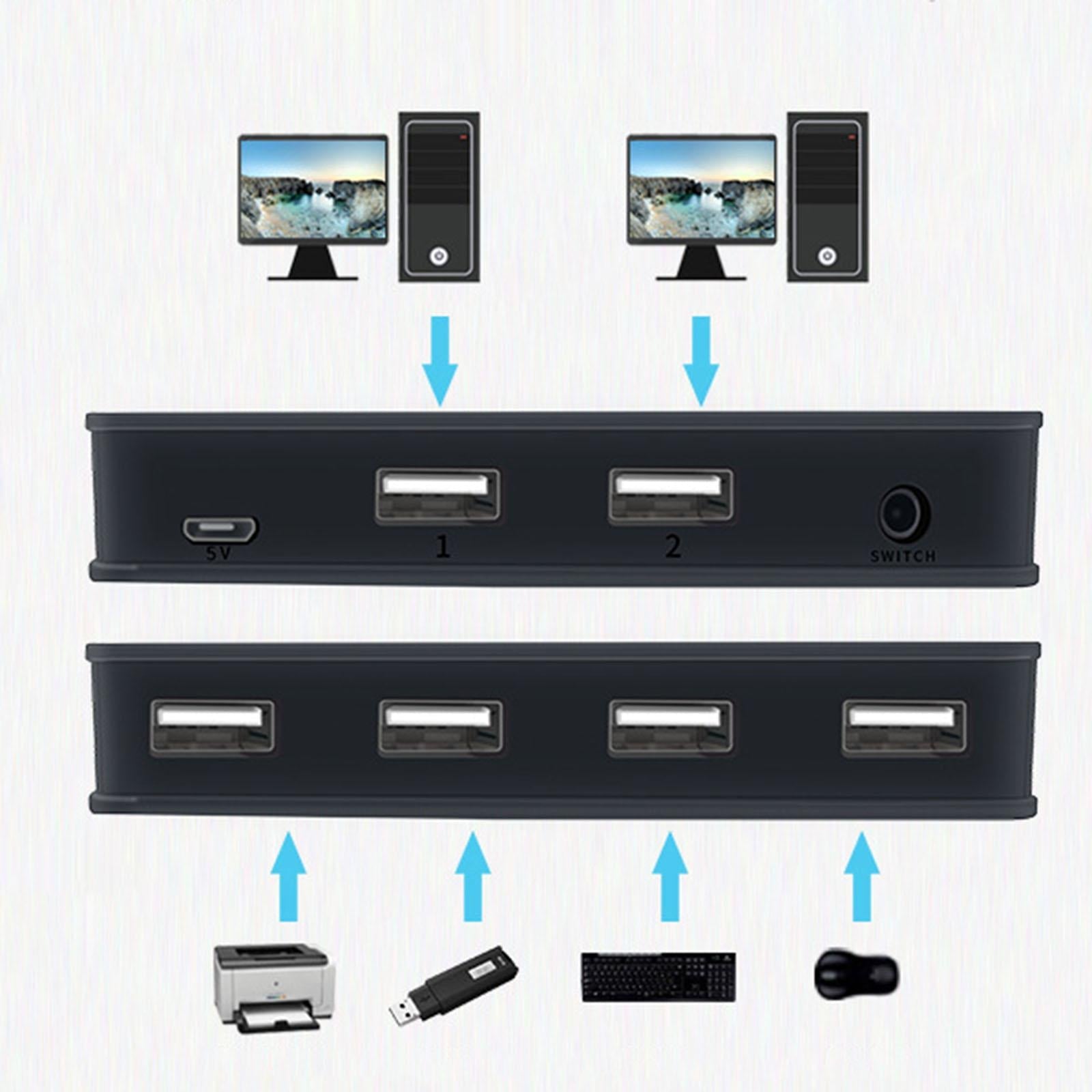 One button exchange between 2 computers. Convenient and efficient, 2 computers share 4 USB devices, plug and play.