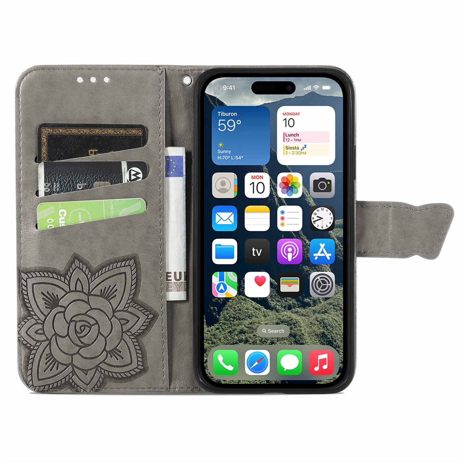 For iPhone 16e Case with Strap Butterfly Pattern PU Leather Wallet Phone Cover - Grey